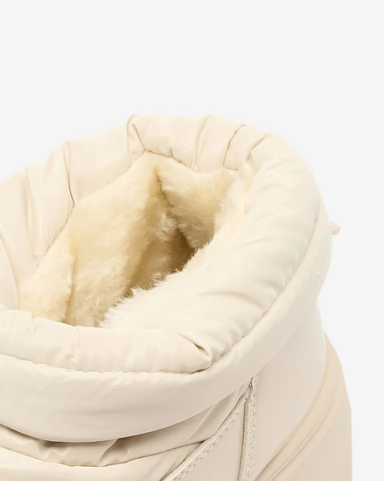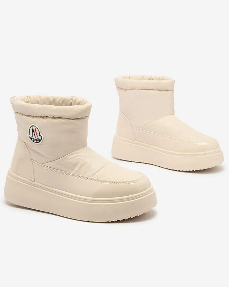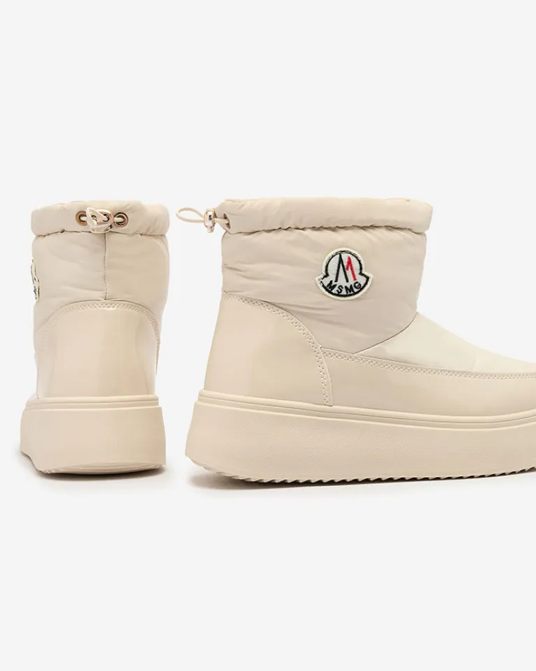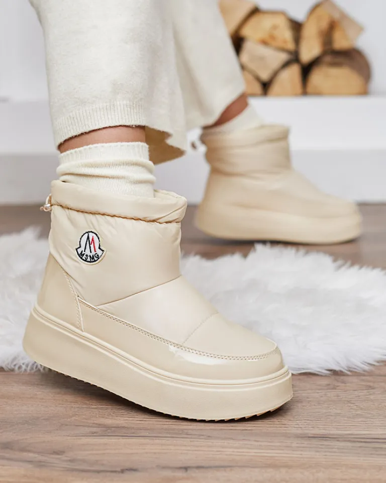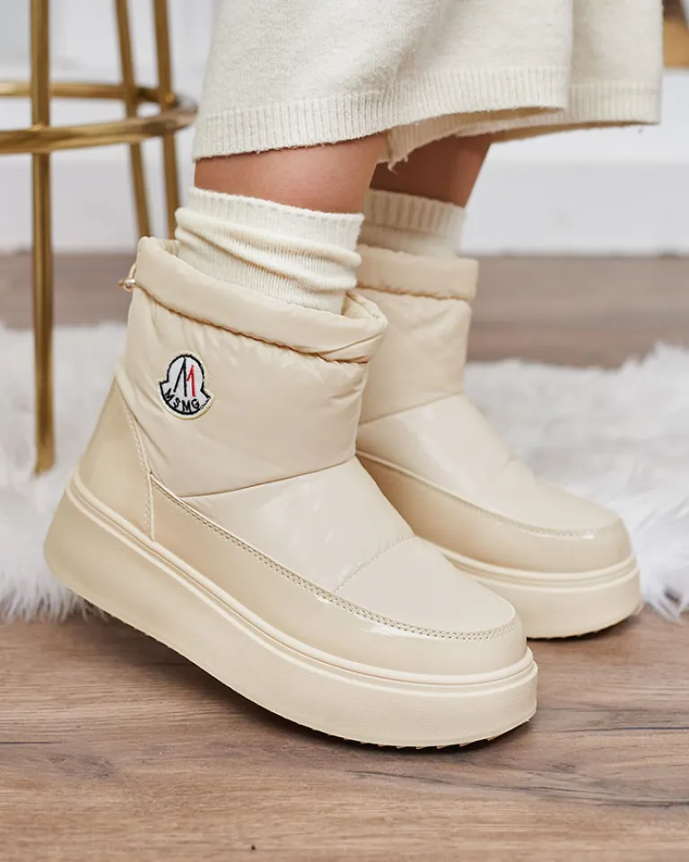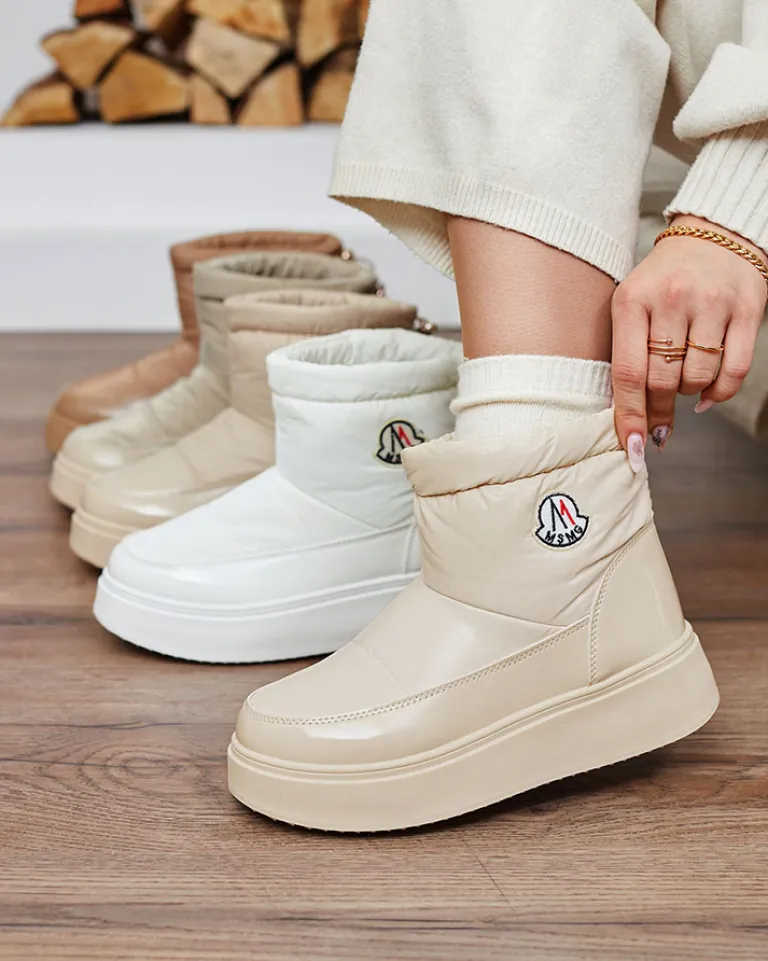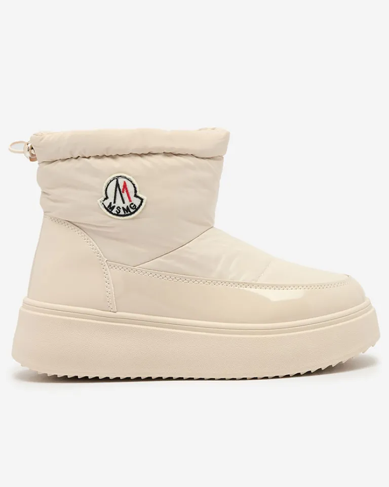 - Ponadczasowe damskie obuwie typu śniegowce z naszywką. Model z cholewką wykonaną z materiału a’la cerata i wstawkami z lakierowanej eko-skóry. W środku ocieplenie w formie futerka, obuwie wsuwane i posiada ściągacz. Idealne na chłodniejszą porę roku!