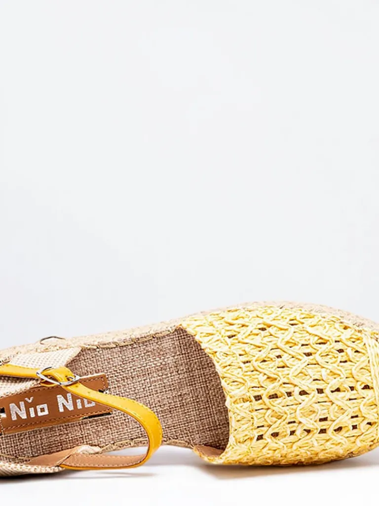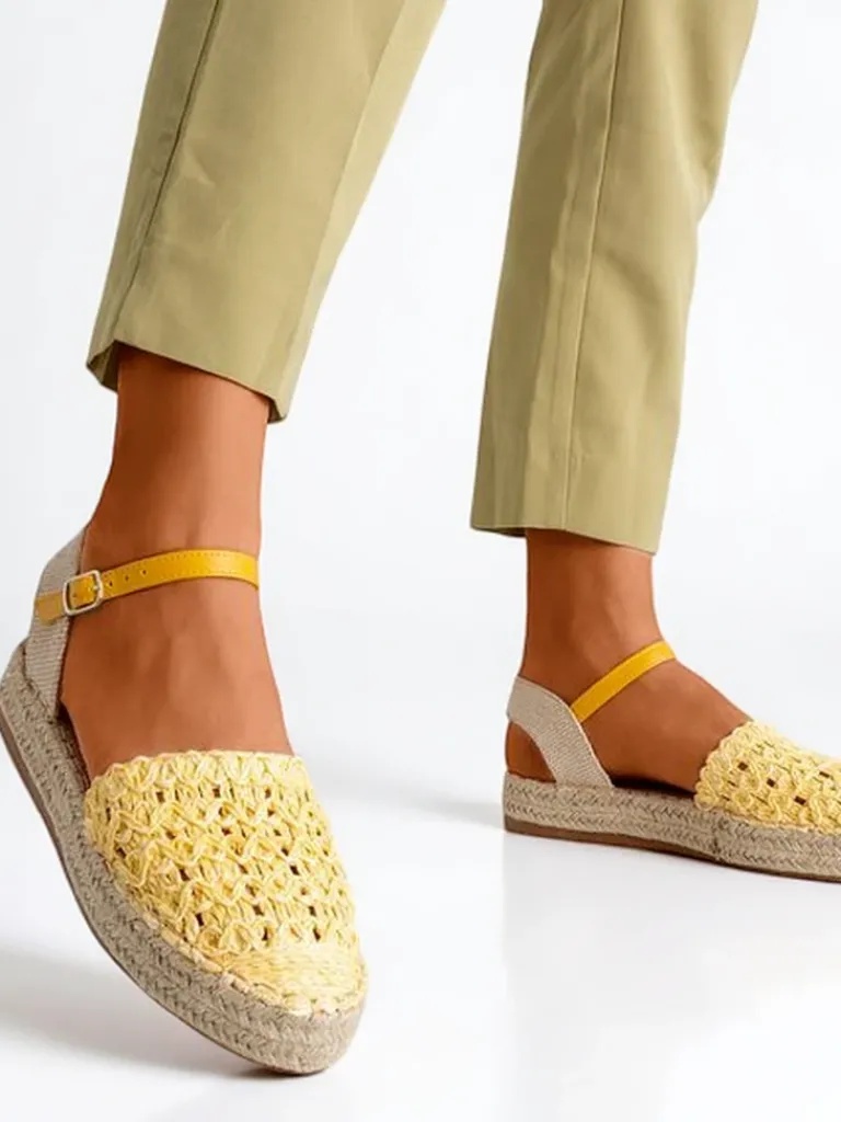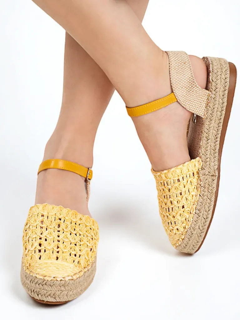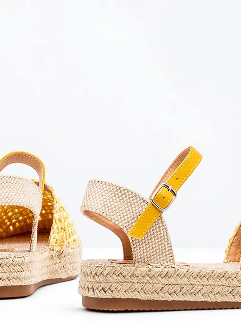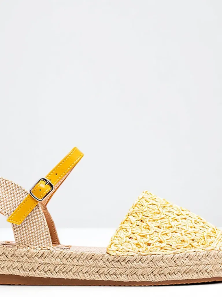 - Żółte damskie espadryle na niskiej platformie. Cholewka wykonana z tworzywa sztucznego. Podeszwa wokół zdobiona plecionym sznurkiem jutowym. Model zapinany sprzączką. Władka tkaninowa. Idealne na lato.