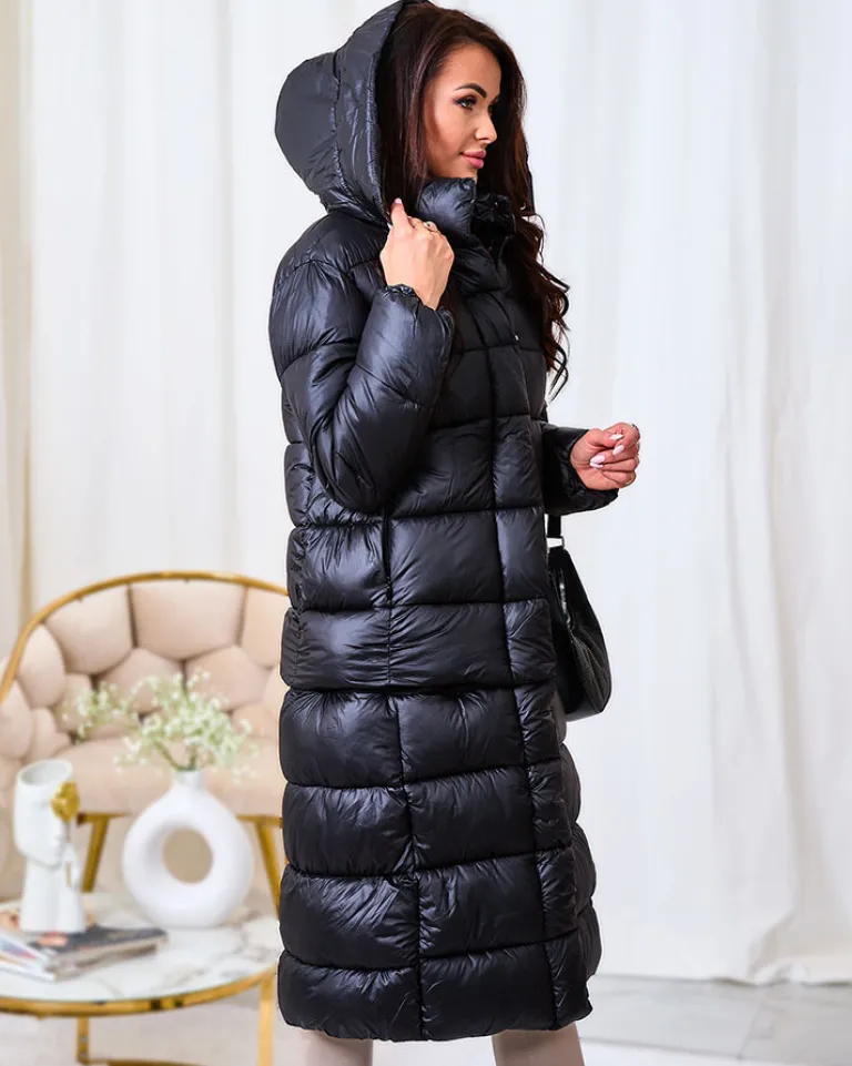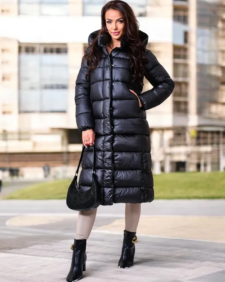 - Ciepła damska kurtka zimowa z odpinanym dołem. Model z możliwością noszenia za kolano lub do bioder. Posiada kaptur, 2 zapinane kieszenie i wypełnienie z puchu syntetycznego. Kurtka zapinana suwakiem i na zatrzaski.