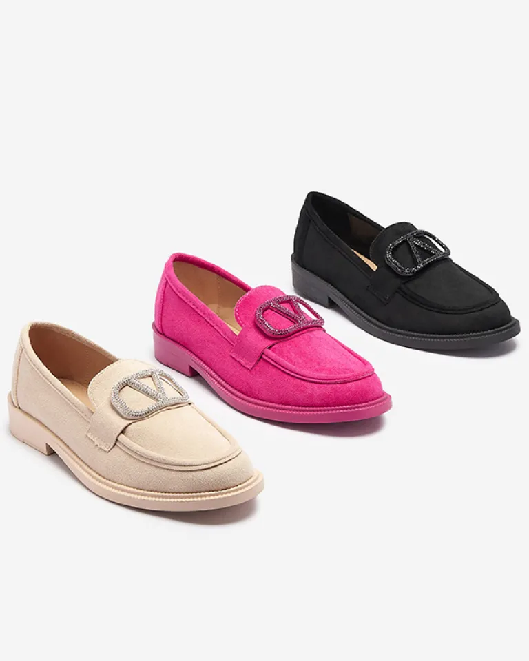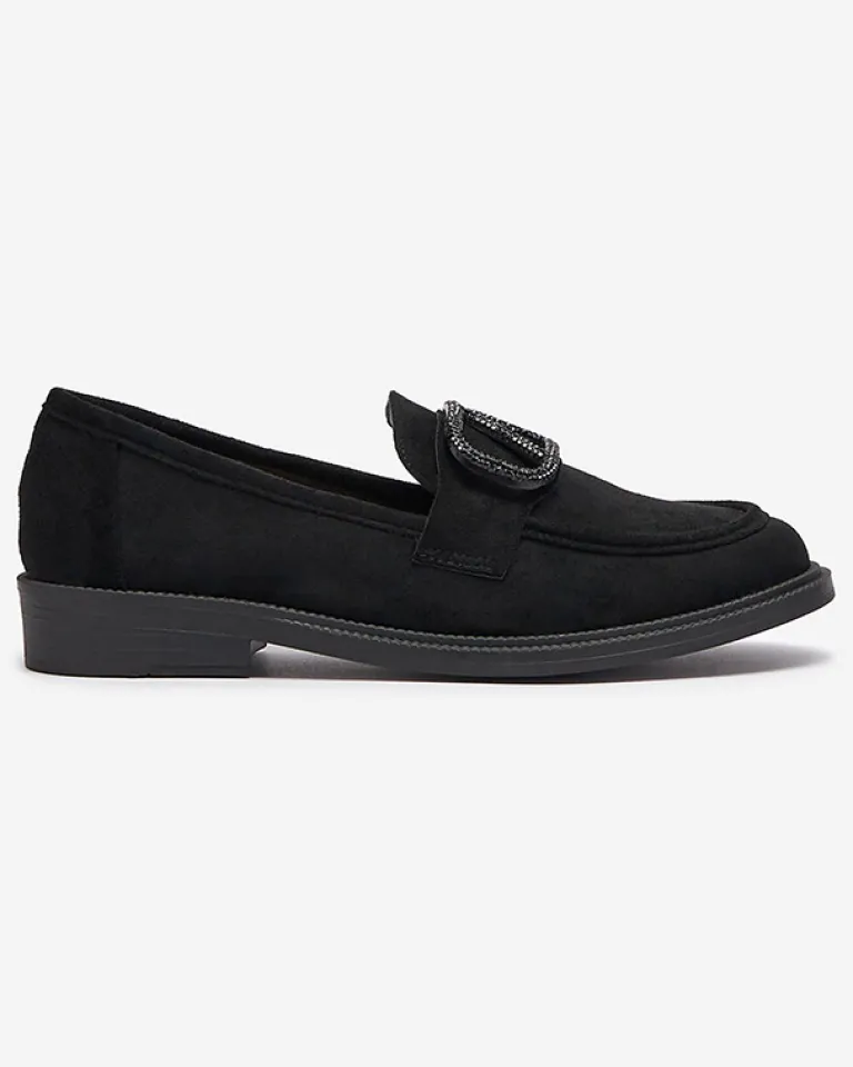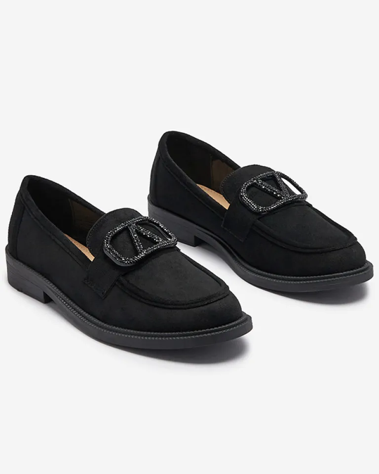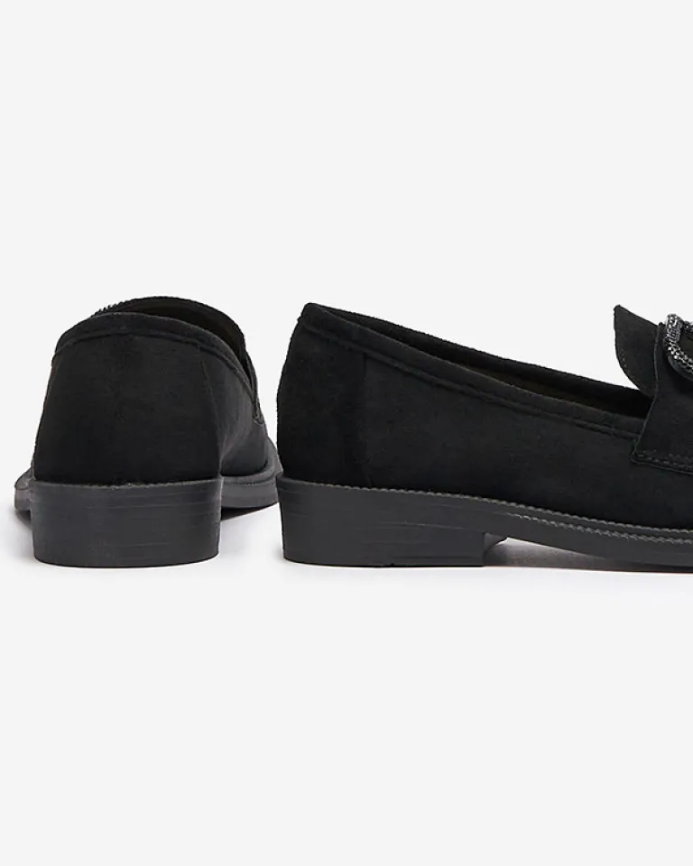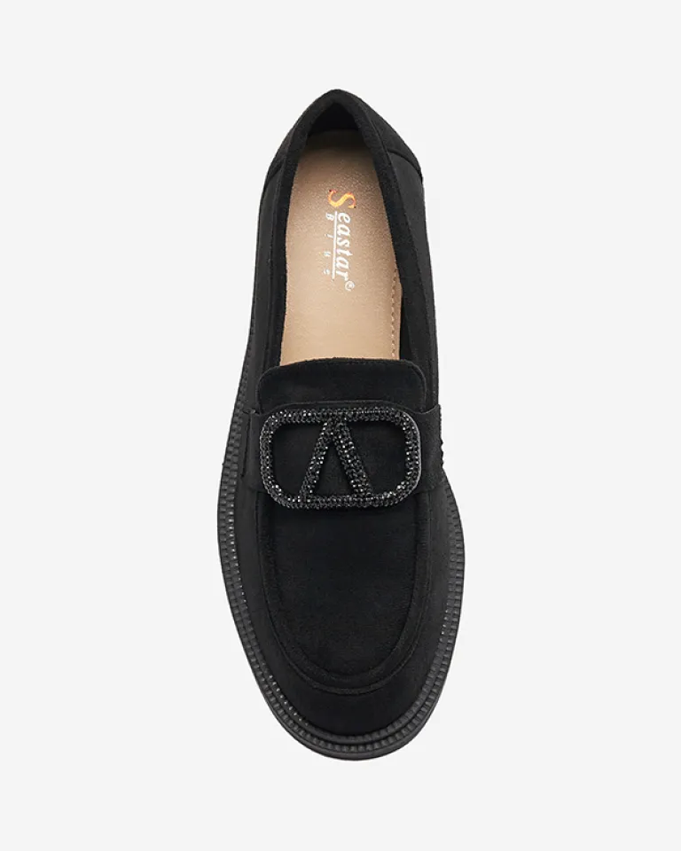 - Casualowe damskie mokasyny z kwadratowym noskiem i ozdobą z cyrkoniami. Cholewka wykonana ze skóry ekologicznej zamszowej, wkładka eko-skórzana. Wygodne i ponadczasowe!