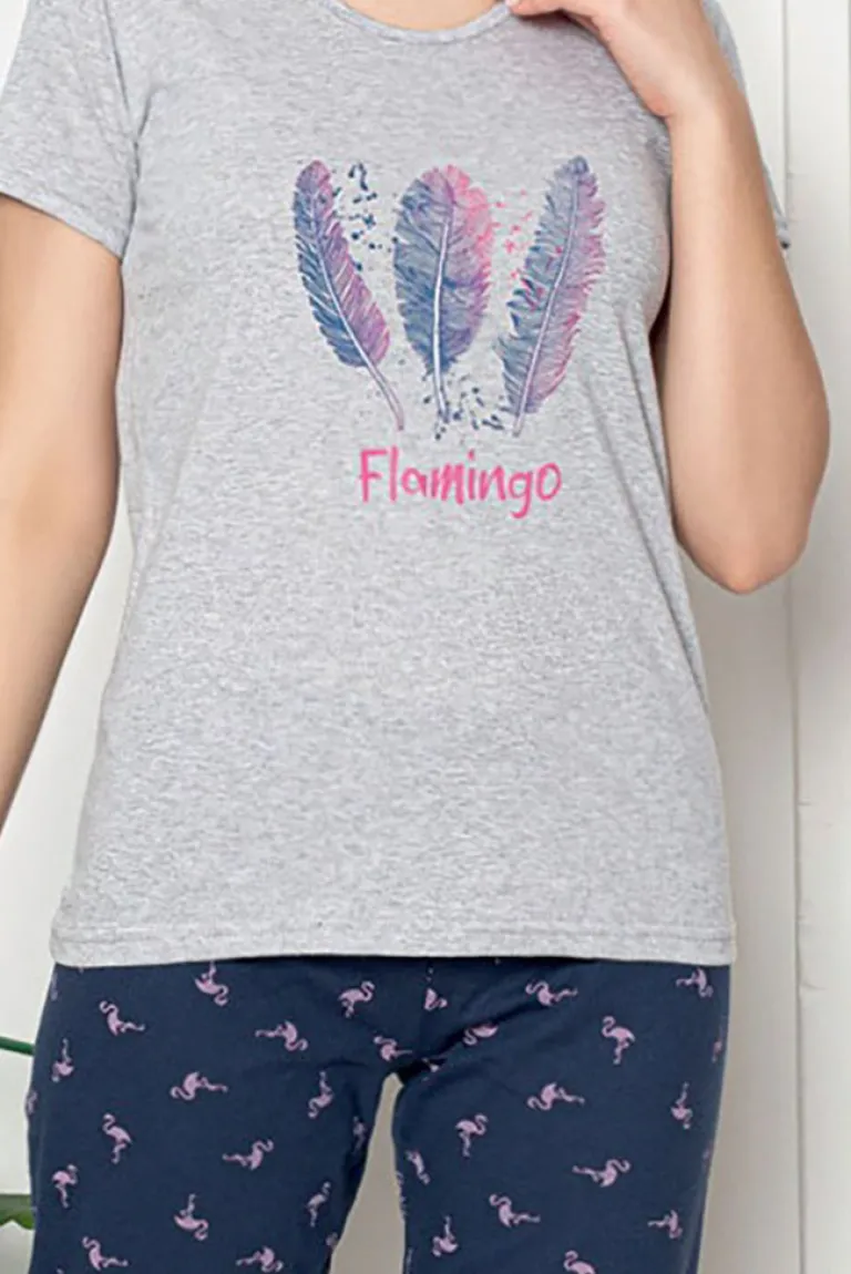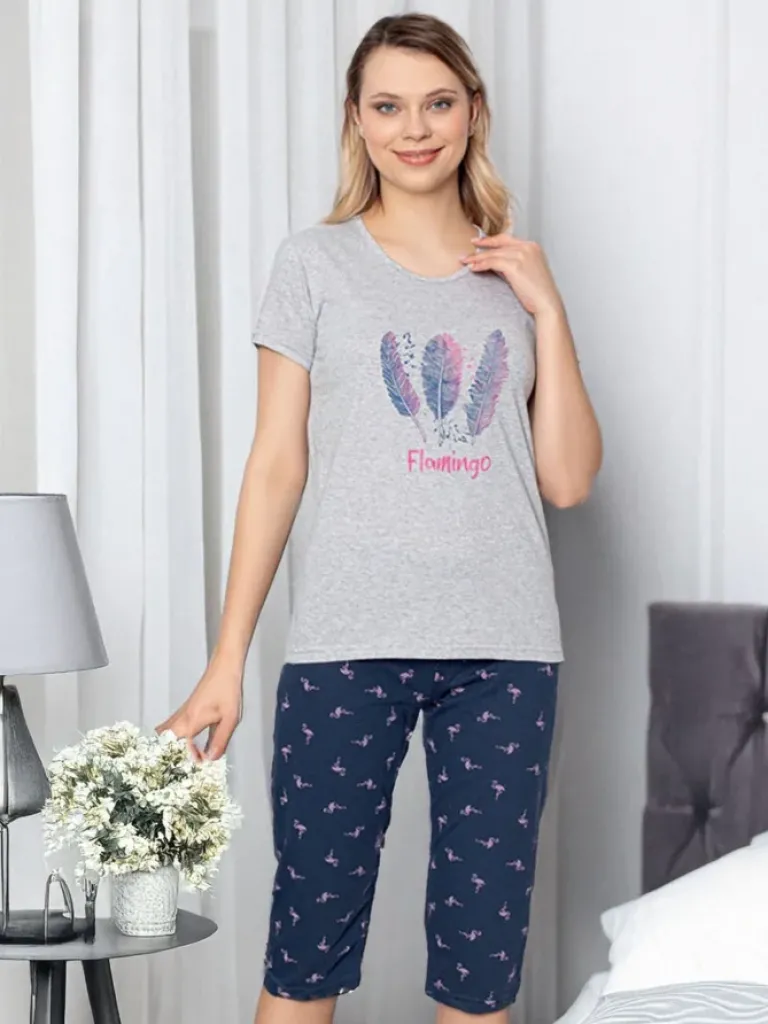 - Damska 2-częściowa piżama wykonana z tkaniny bawełnianej, wykończonej ozdobnym printem. Komplet posiada bluzkę z krótkimi rękawami oraz spodnie 3/4 z gumą w pasie.