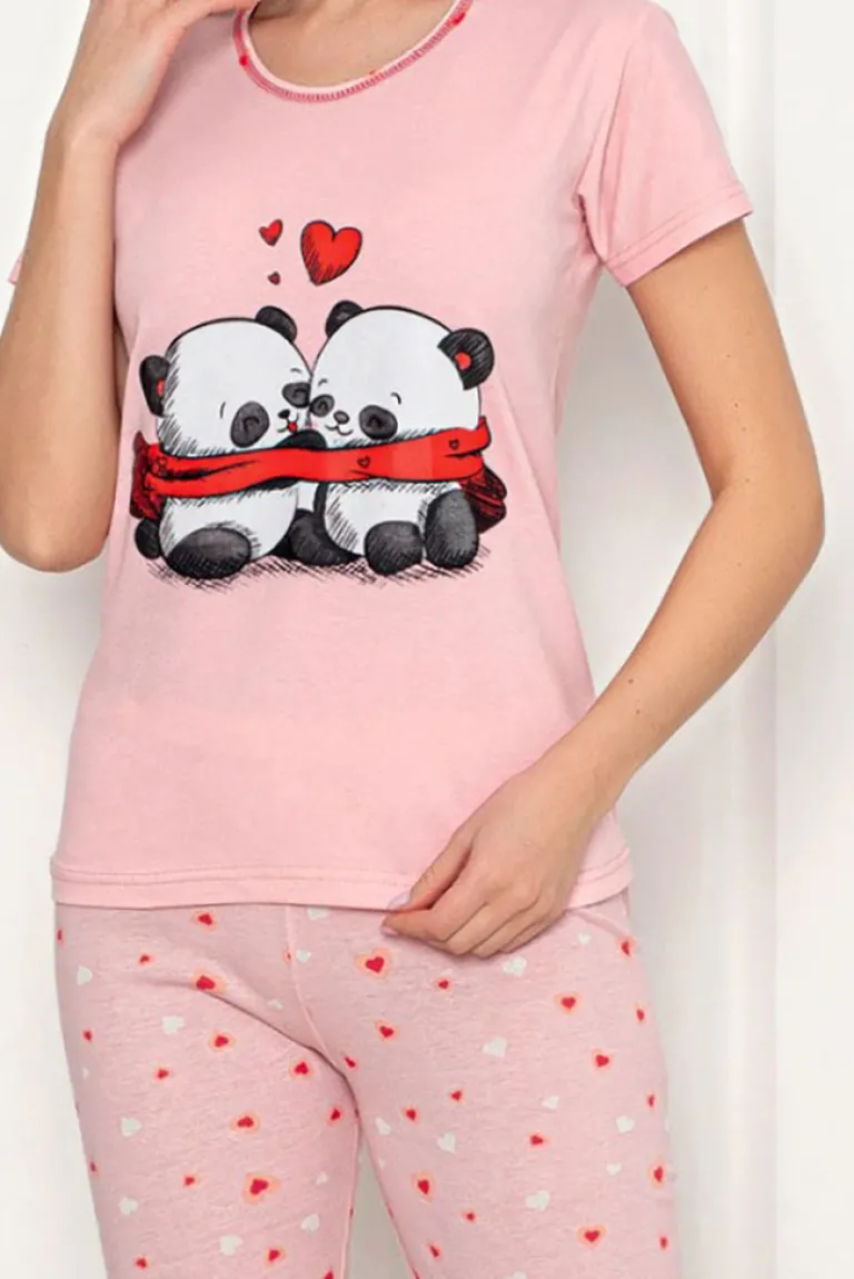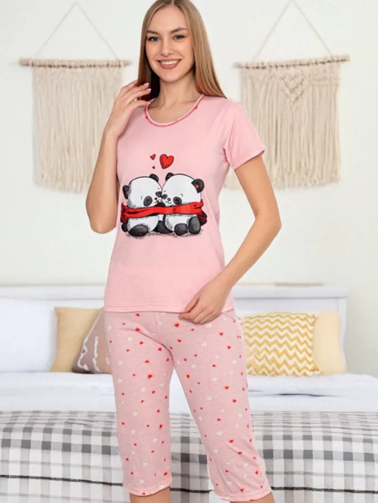 - Damska 2-częściowa piżama wykonana z tkaniny bawełnianej wykończonej ozdobnym printem. Komplet posiada bluzkę z długimi rękawami oraz spodnie 3/4 z gumą w pasie.