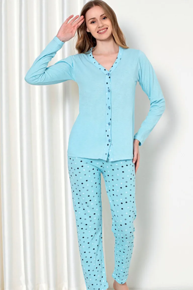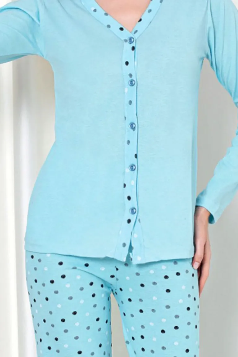 - Damska 2-częściowa piżama wykonana z tkaniny bawełnianej wykończonej ozdobnym printem. Komplet posiada bluzkę z długimi rękawami oraz spodnie z gumą w pasie i prostymi nogawkami.