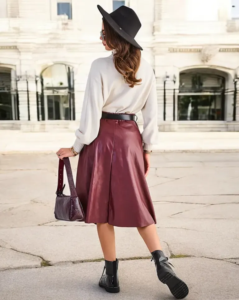 - Damska spódnica midi wykonana z materiału a’la skóra. Model posiada elastyczną gumę w pasie. Idealna baza dla wielu wyjątkowych outfitów! Model posiada pasek w zestawie. UWAGA: Dokładność pomiaru (+/-) 1 cm.