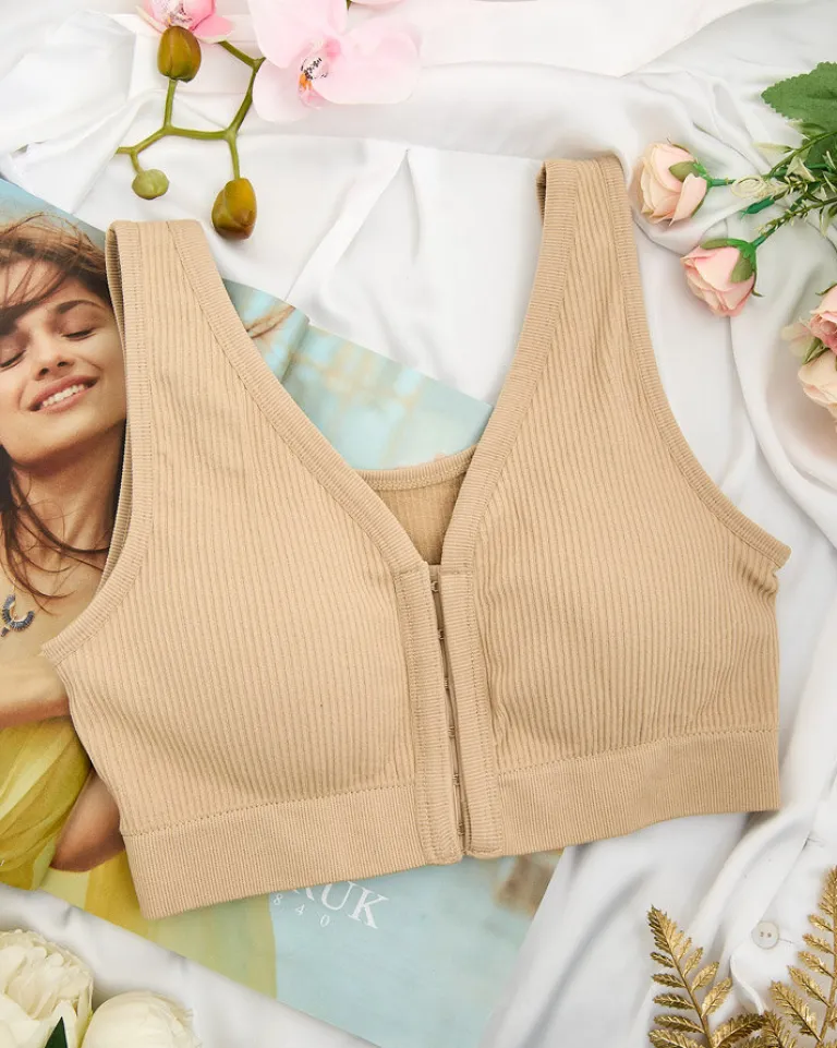 - Klasyczny sportowy damski biustonosz wykonany z elastycznego, przyjemnego materiału. Model posiada zapięcie z przodu na haftki, z szerokimi ramiączkami i z możliwością wyjmowania wkładek, wykończony na dole szeroką gumą. Idealnie dopasuje się do ciała.