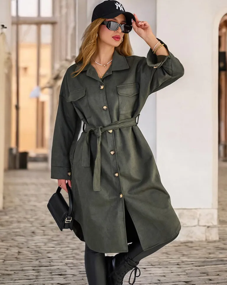- Stylowy damski płaszcz typu koszula z paskiem. Płaszcz o kroju over size, posiada długie rękawy i zapięcie na guziki. Model z 4 kieszeniami. Świetny na jesień!