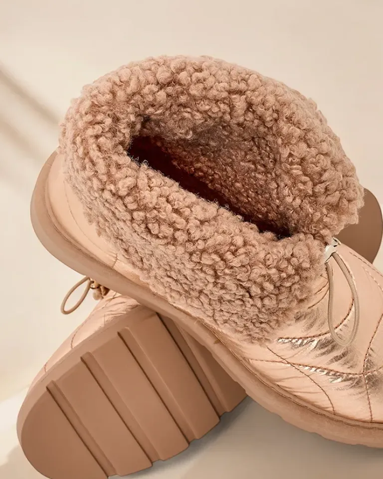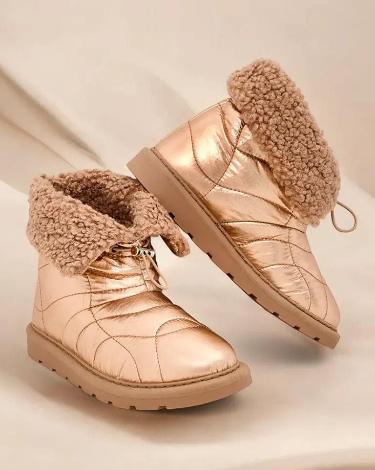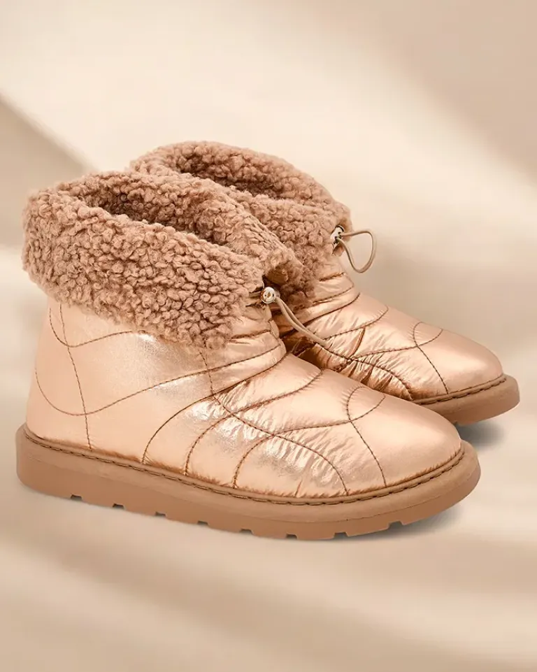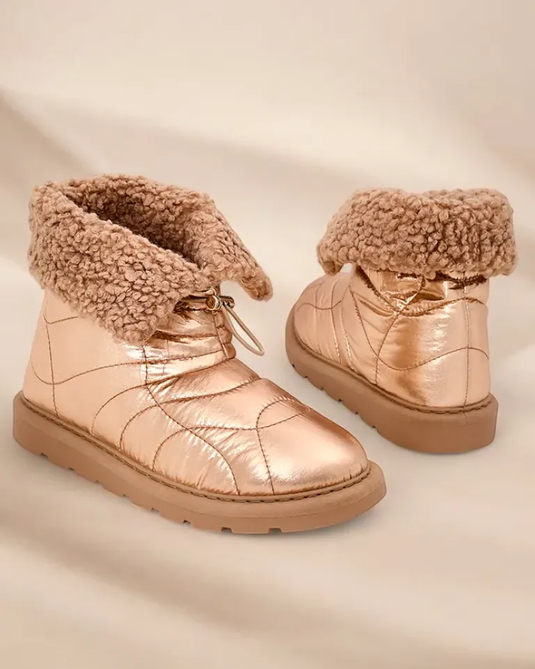 - Damskie obuwie typu śniegowce z cholewką wykonaną z materiału a’la cerata. W środku ocieplenie w formie futerka, obuwie wsuwane, posiada ściągacz. Idealne na chłodniejszą porę roku!