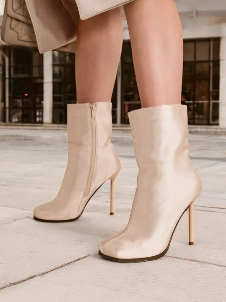 - Eleganckie botki na szpilce wykonane z tkaniny a’la satyna, zapinane na suwak. Model posiada kwadratowy nosek. Świetne buty do jesiennych kreacji!