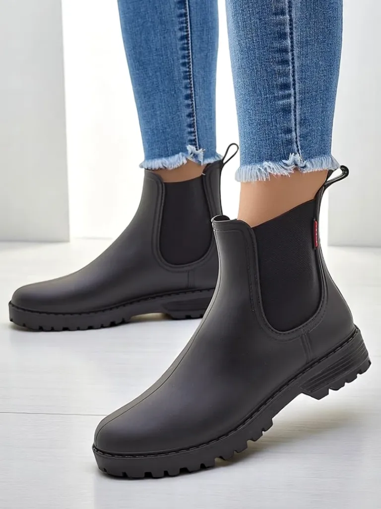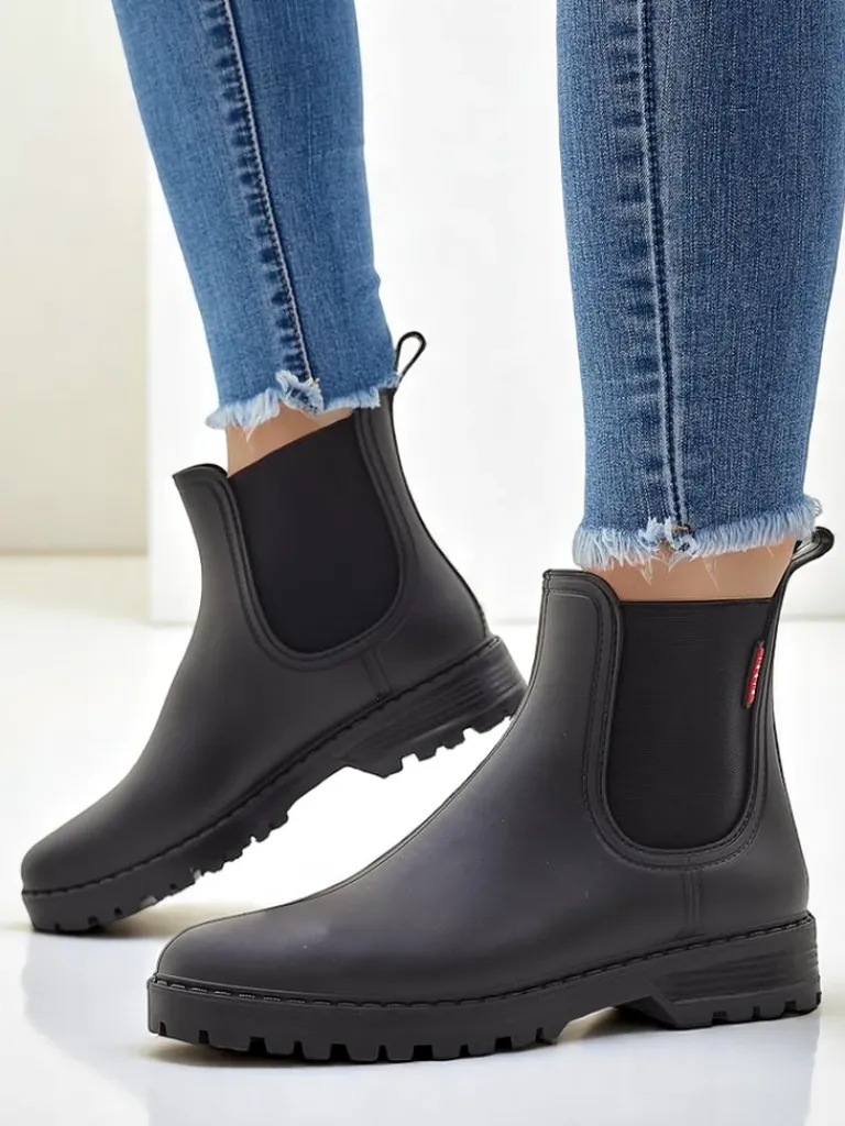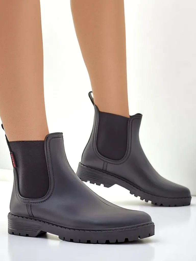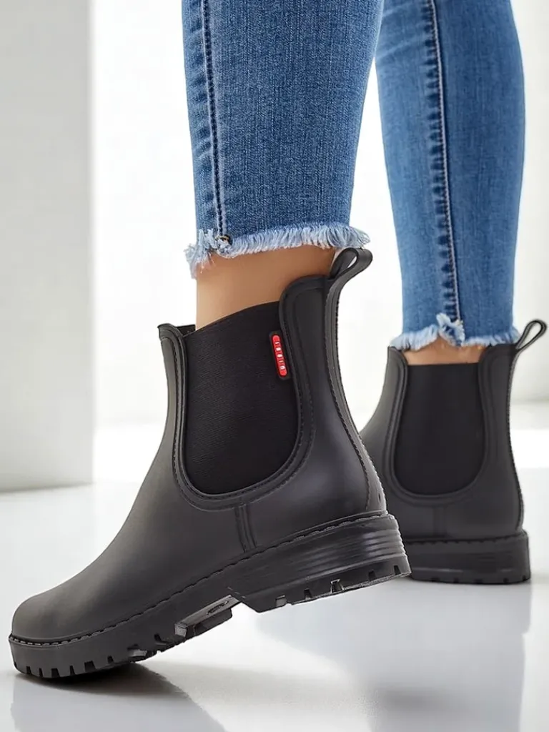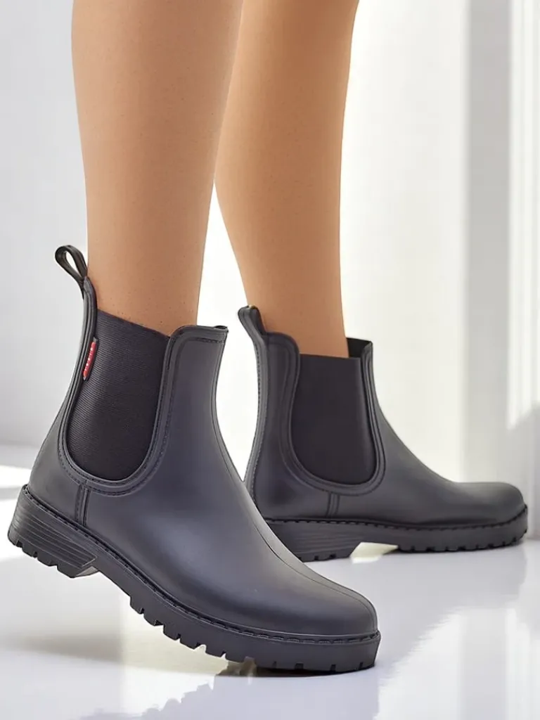 - Klasyczne damskie kalosze na płaskim obcasie, wykonane z materiału gumowego. W środku wkładka z tkaniny. Idealne na jesienne deszczowe dni!