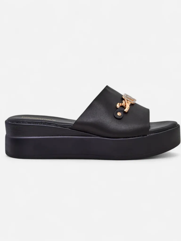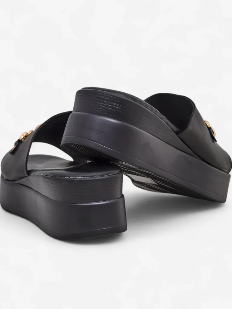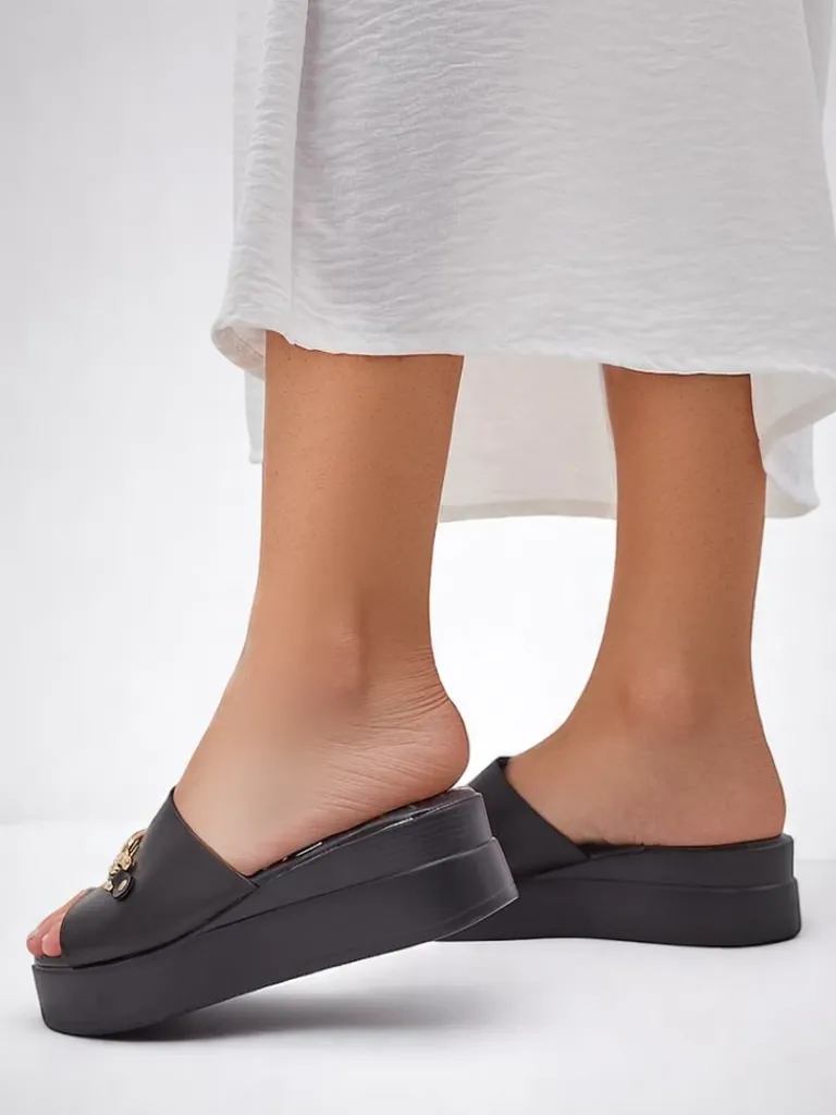 - Klapki damskie wykonane ze skóry ekologicznej i eko skórzanej wkładki. Wysoki koturn, platforma i ozdobna klamerka dodaje uroku i charakteru. Ciesz się wygodą i stylem zabierając te obuwie na wakacje!