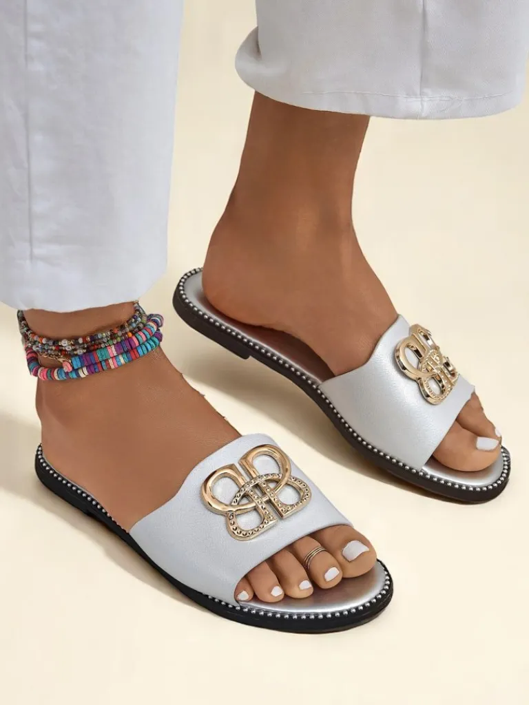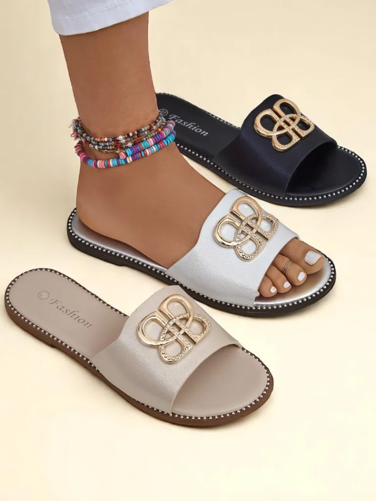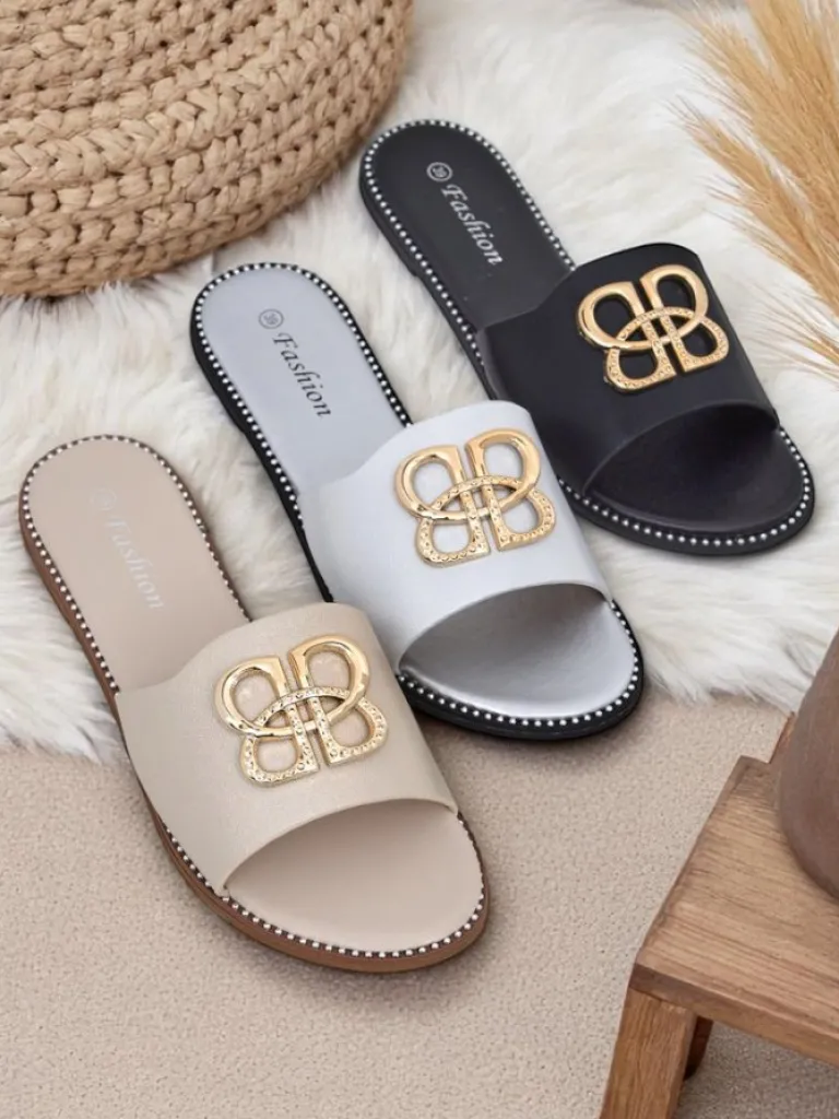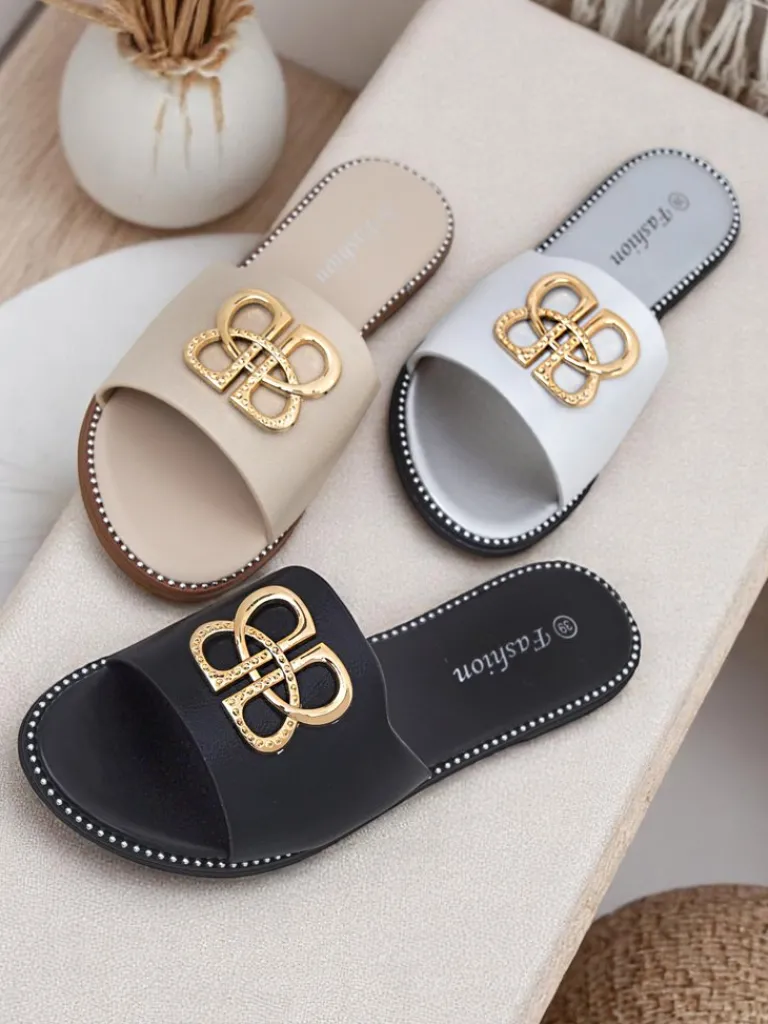 - Stylowe klapki z eko skóry na płaskiej podeszwie, zdobione złotą ozdobą. Komfort i elegancja na co dzień, które dodadzą blasku każdej letniej stylizacji.