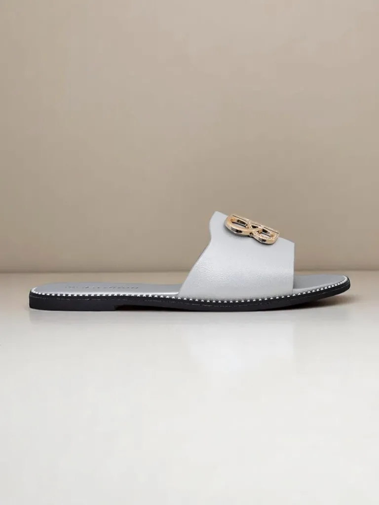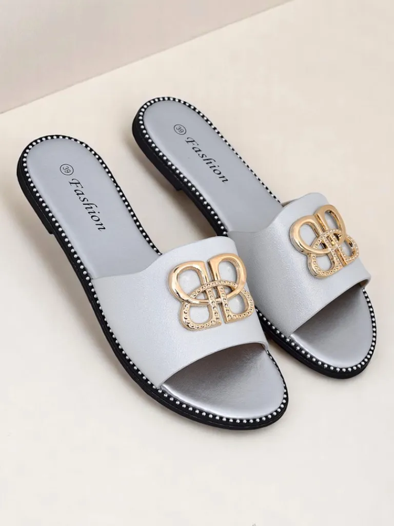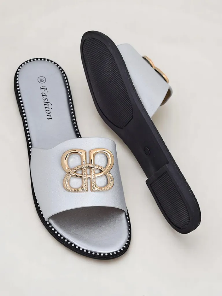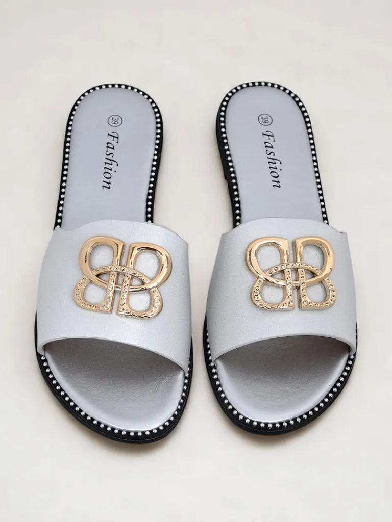 - Stylowe klapki z eko skóry na płaskiej podeszwie, zdobione złotą ozdobą. Komfort i elegancja na co dzień, które dodadzą blasku każdej letniej stylizacji.