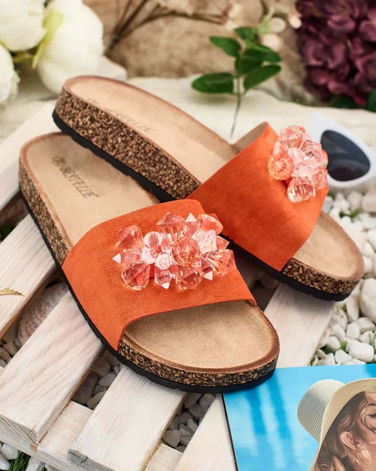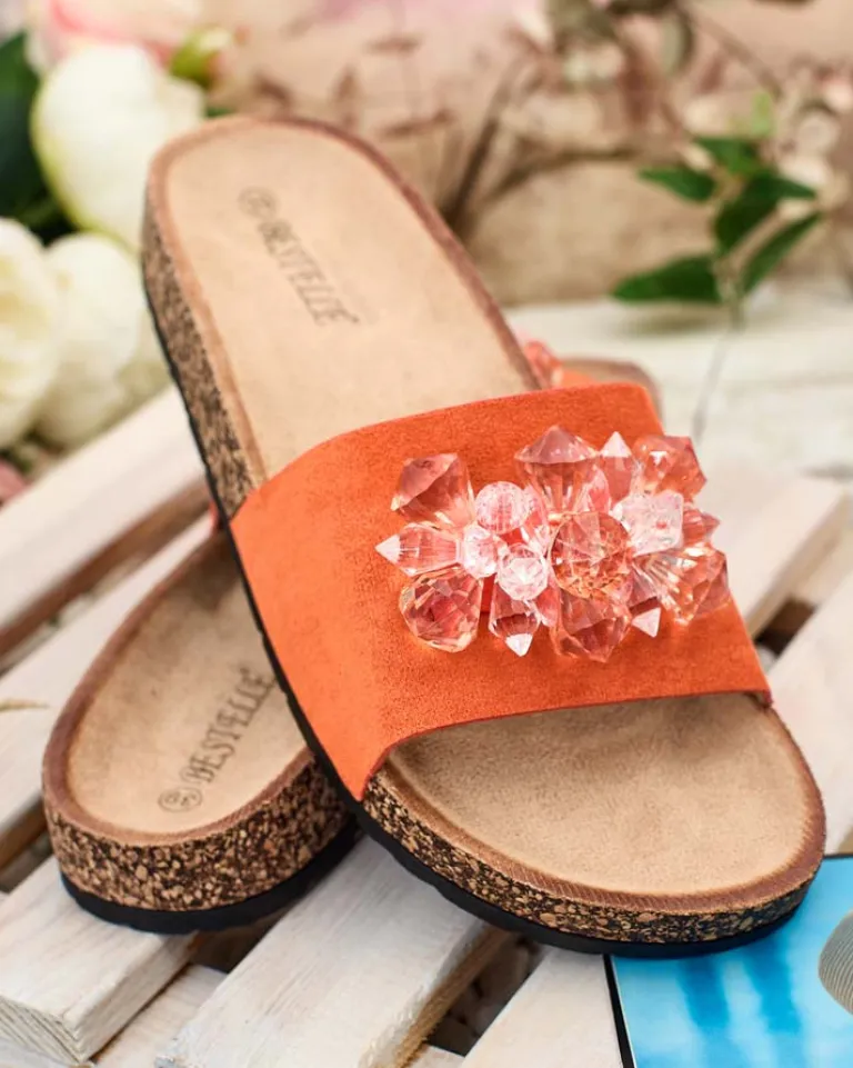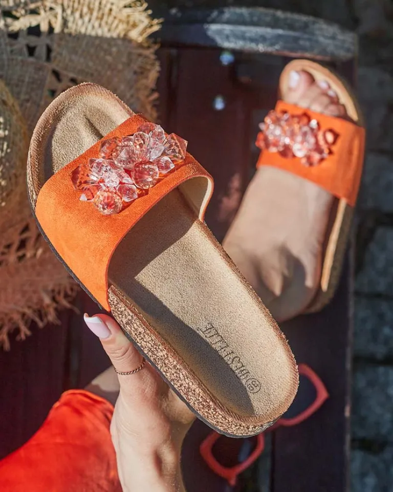 - Płaskie klapki z kryształkami na paseczku to wyjątkowe połączenie stylu i wygody. Cholewka i wkładka wykonane z eko-zamszu nadają im elegancki wygląd. Podeszwa ozdobiona tworzywem przypominającym korek – dodaje im oryginalności!