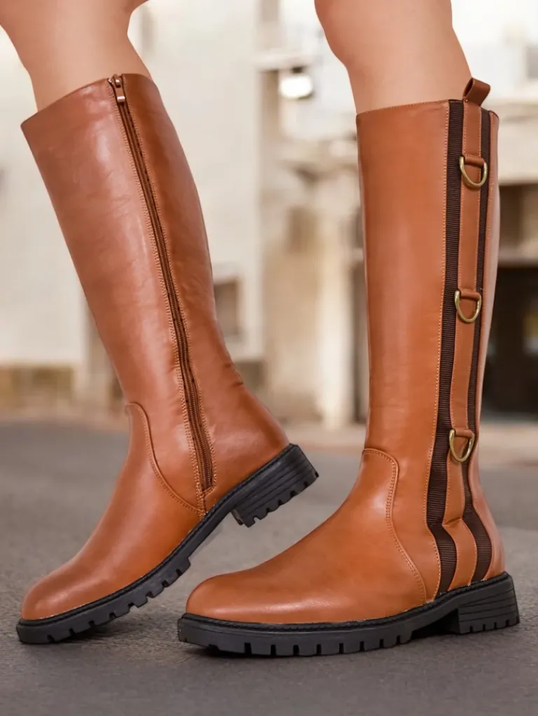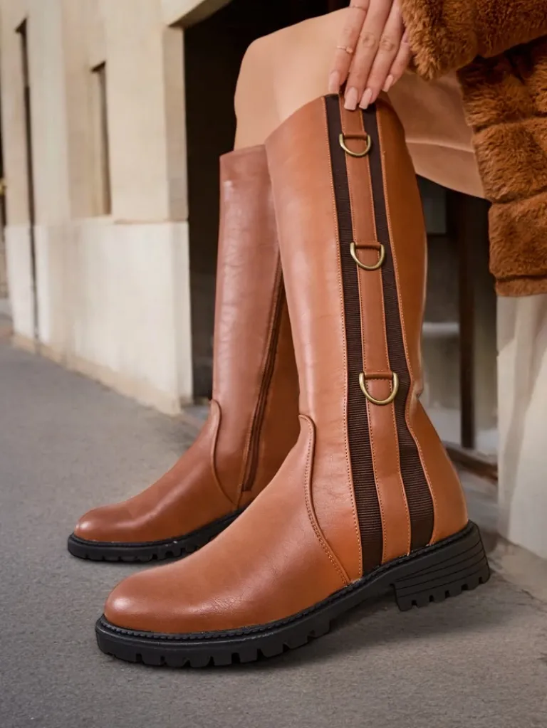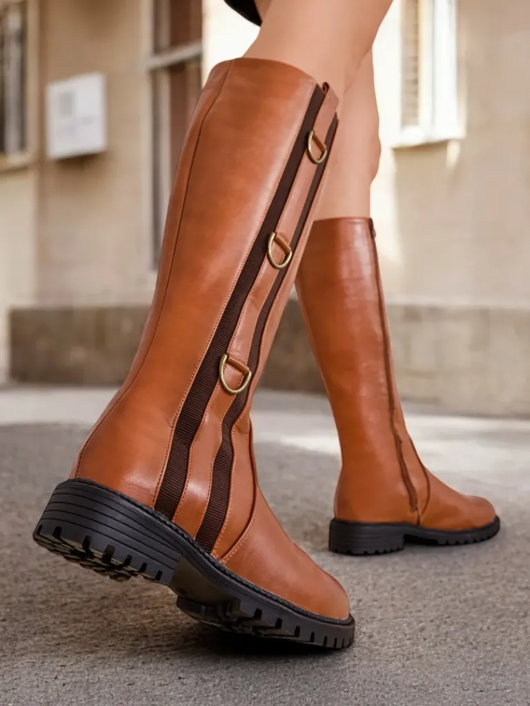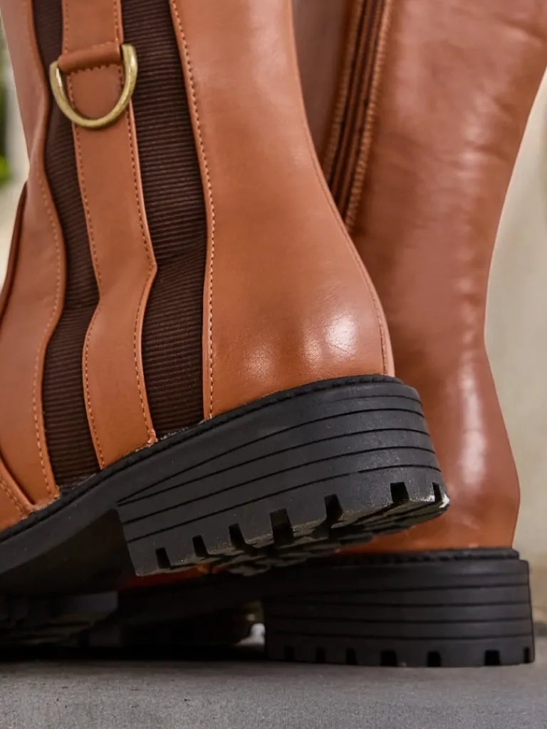 - Damskie kozaki do kolana, wykonane z eko skóry. Model na płaskim obcasie. Obuwie zapinane na zamek. Wkładka tkaninowa. Posiadają elastyczną wstawkę po boku.