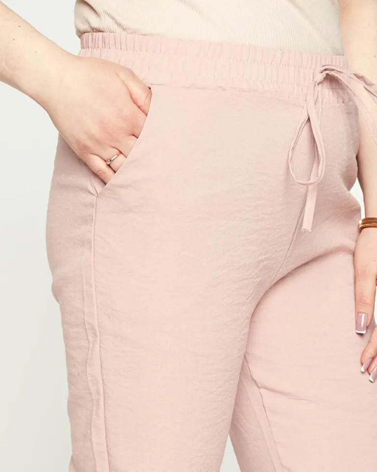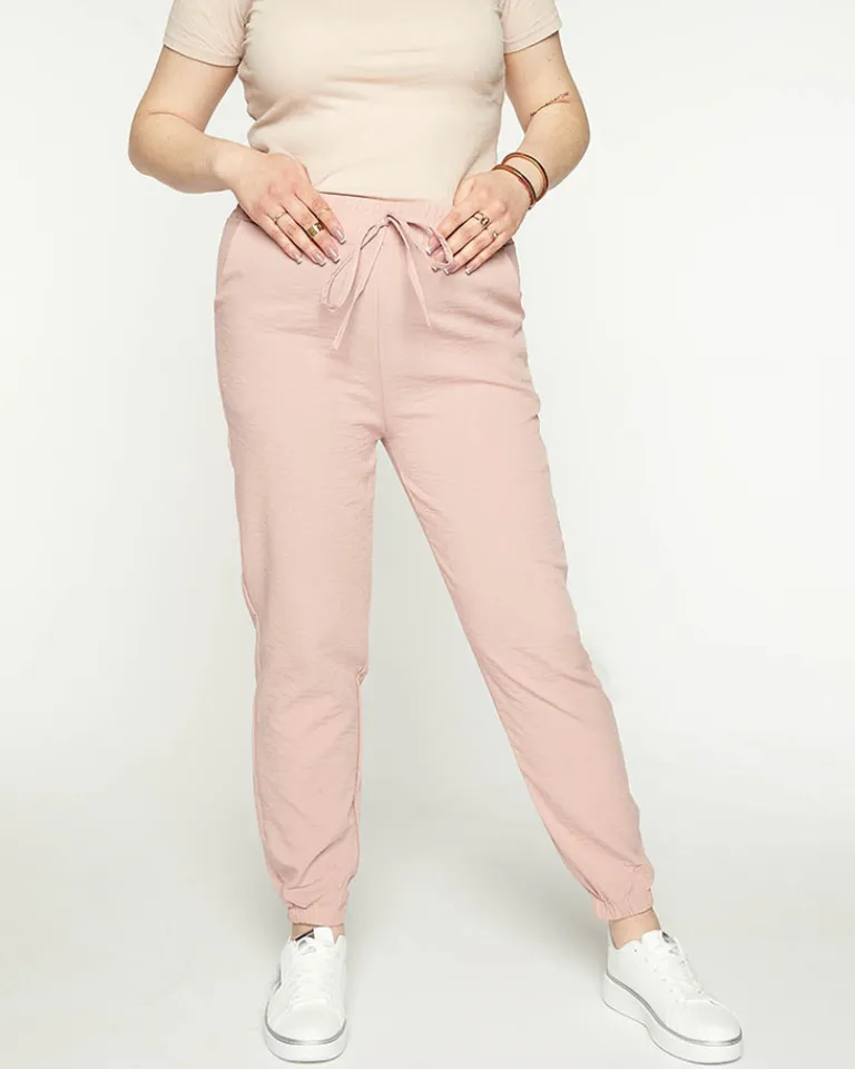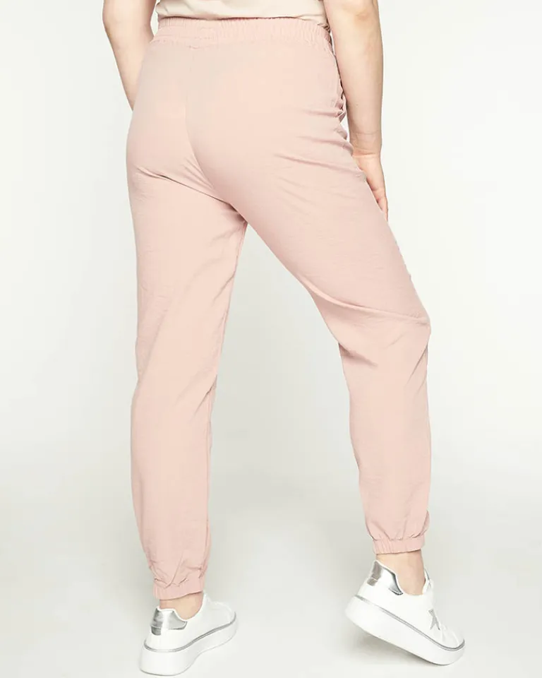 - Klasyczne damskie spodnie z długimi nogawkami o luźnym kroju, zakończone na dole ściągaczami. Model z wysokim stanem, elastyczną gumką w pasie i 2 kieszeniami. UWAGA: Dokładność pomiaru (+/-) 1 cm. Wymiary mierzone na płasko.