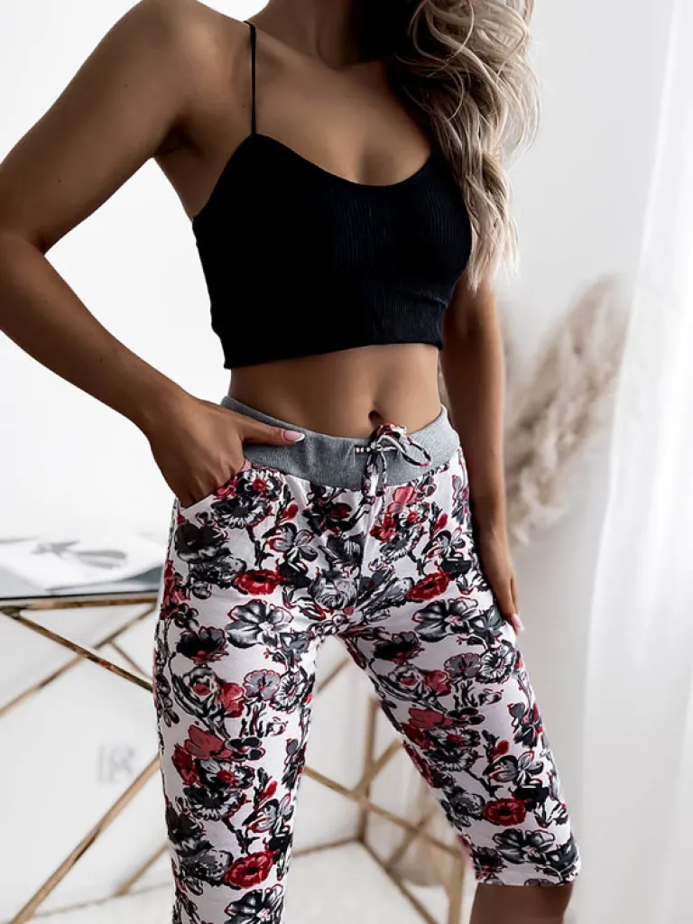 - Wygodne damskie spodenki 3/4 z kieszeniami, wykonane z tkaniny bawełnianej w kwiaty. Model posiada gumę oraz wiązane toczki w pasie. UWAGA: Dokładność pomiaru (+/-) 1 cm.
