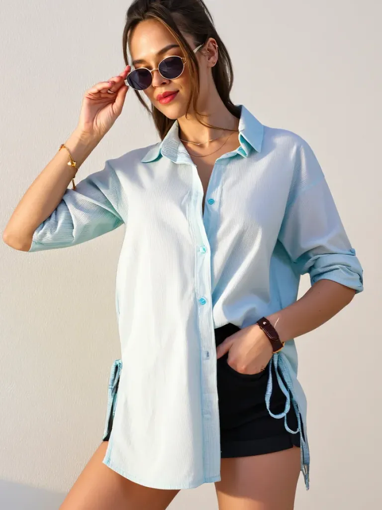 - Bawełniana dłuższa damska koszula w paski z wiązaniem w talii to połączenie wygody i stylu. Lekka tkanina i dopasowany krój podkreślają sylwetkę, tworząc modny i casualowy look. UWAGA: Dokładność pomiaru (+/-) 1 cm.