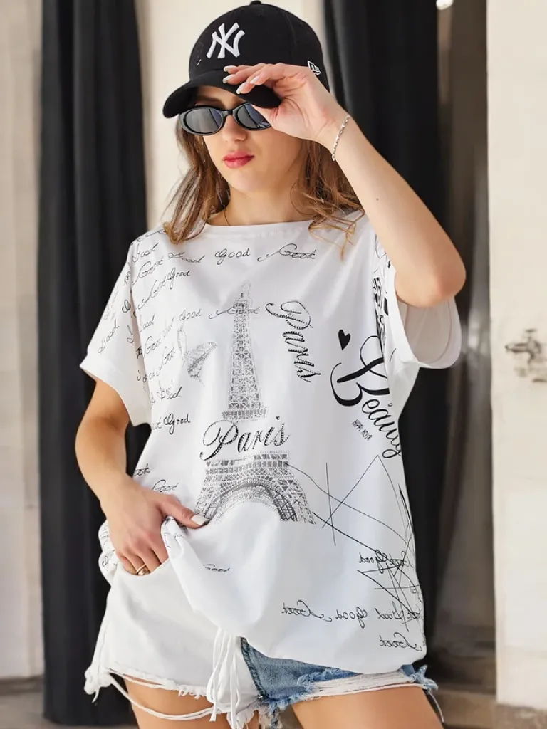 - Bawełniany damski t-shirt to komfortowa i stylowa propozycja na co dzień. Wykonany z miękkiej bawełny, zapewnia wygodę przez cały dzień. Zdobiony subtelnym nadrukiem, z ściągaczem na dole, który nadaje mu lekko sportowy charakter.