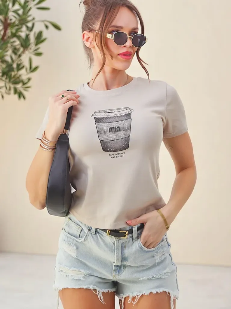 Discount Bawełniany damski t-shirt z nadrukiem z cyrkonii Bluzki / Koszule / Koszulki
