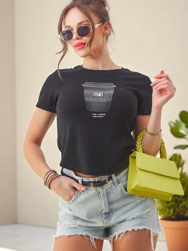 Discount Bawełniany damski t-shirt z nadrukiem z cyrkonii Bluzki / Koszule / Koszulki