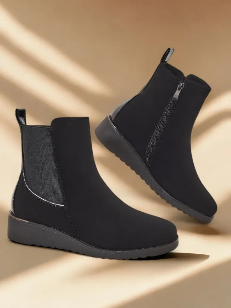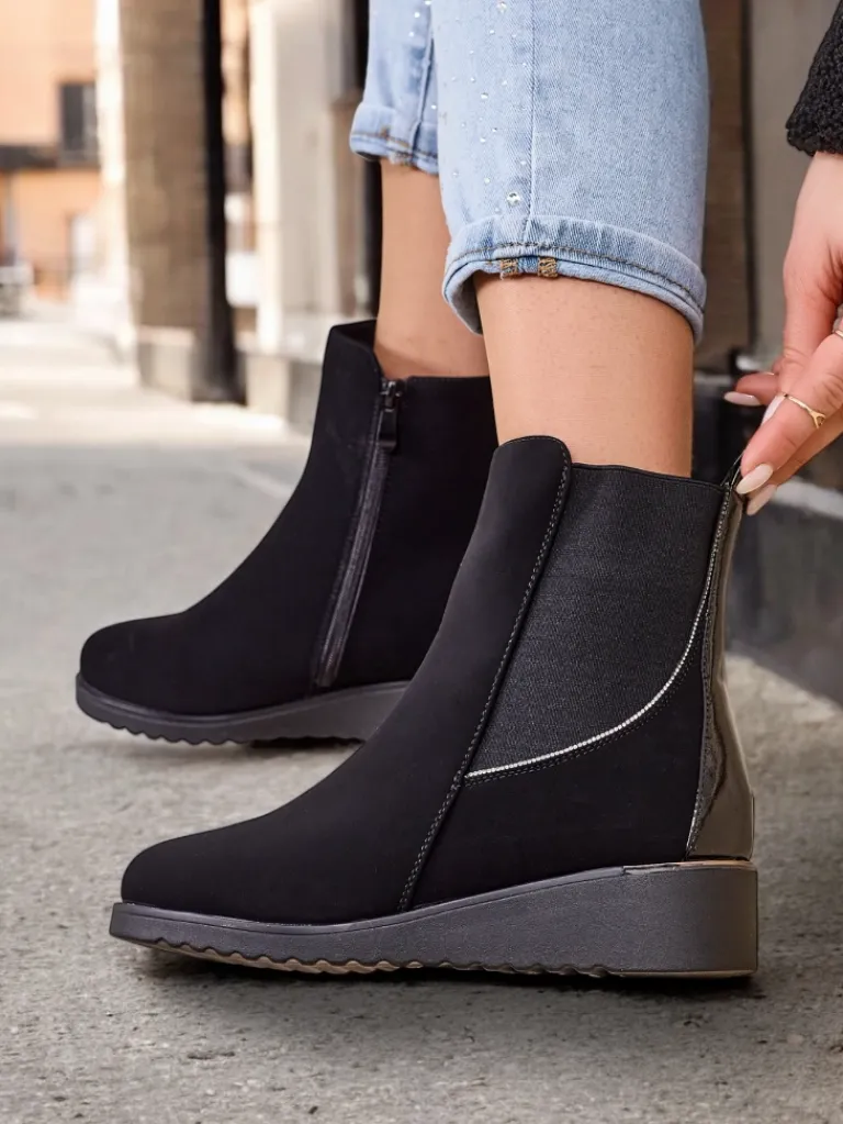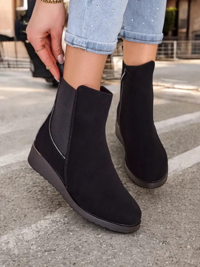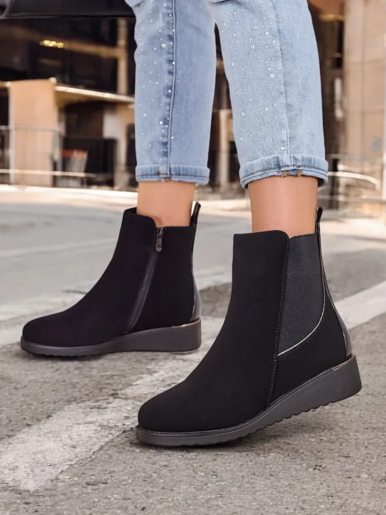 - Rewelacyjne botki damskie na koturnie, wykonane są z eko skóry matowej oraz z dodatkiem eko skóry lakierowanej. Wnętrze wykonane z przyjemnego futerka. Model zapinany na suwak oraz posiada zdobioną cholewkę cyrkoniami. Idealne do jesiennych kreacji!