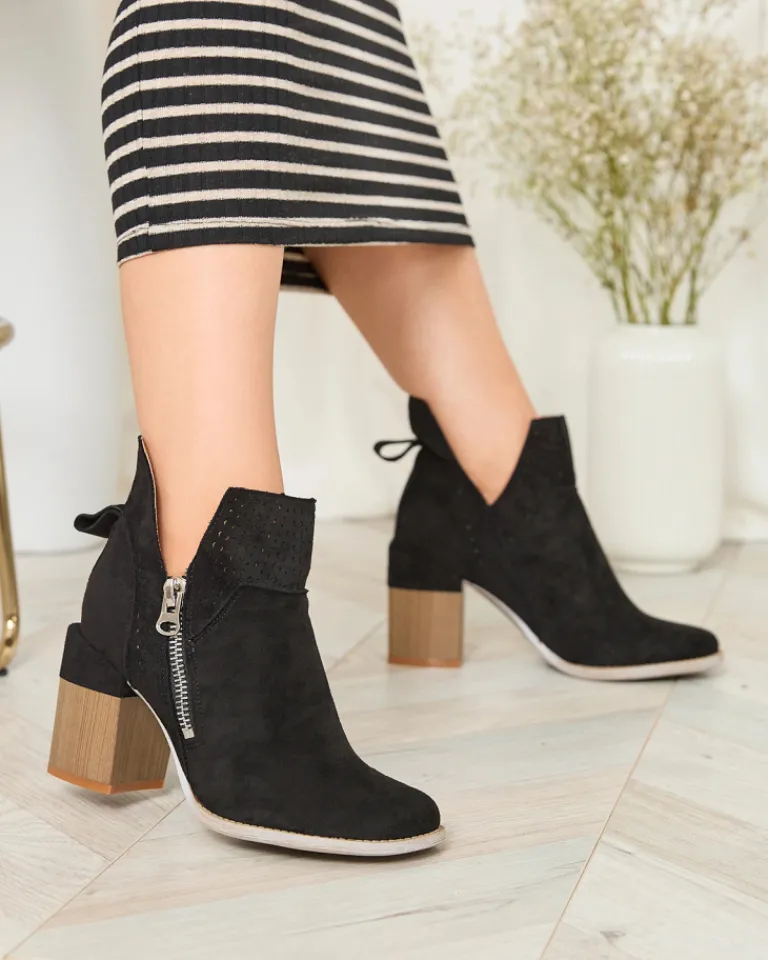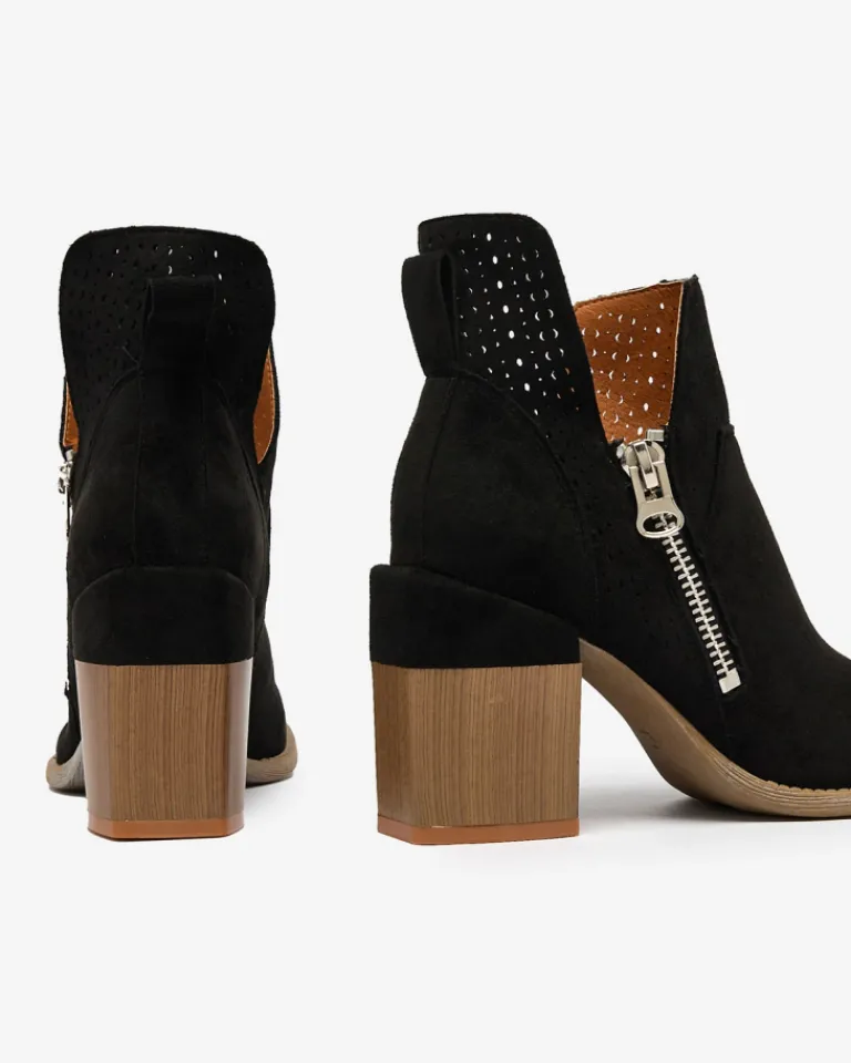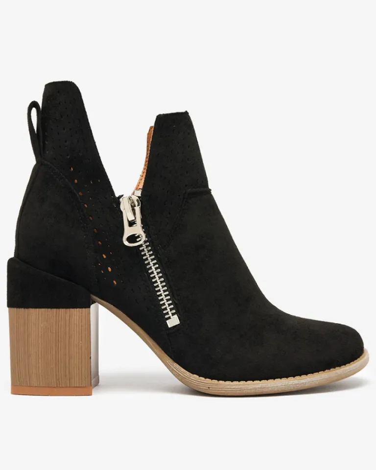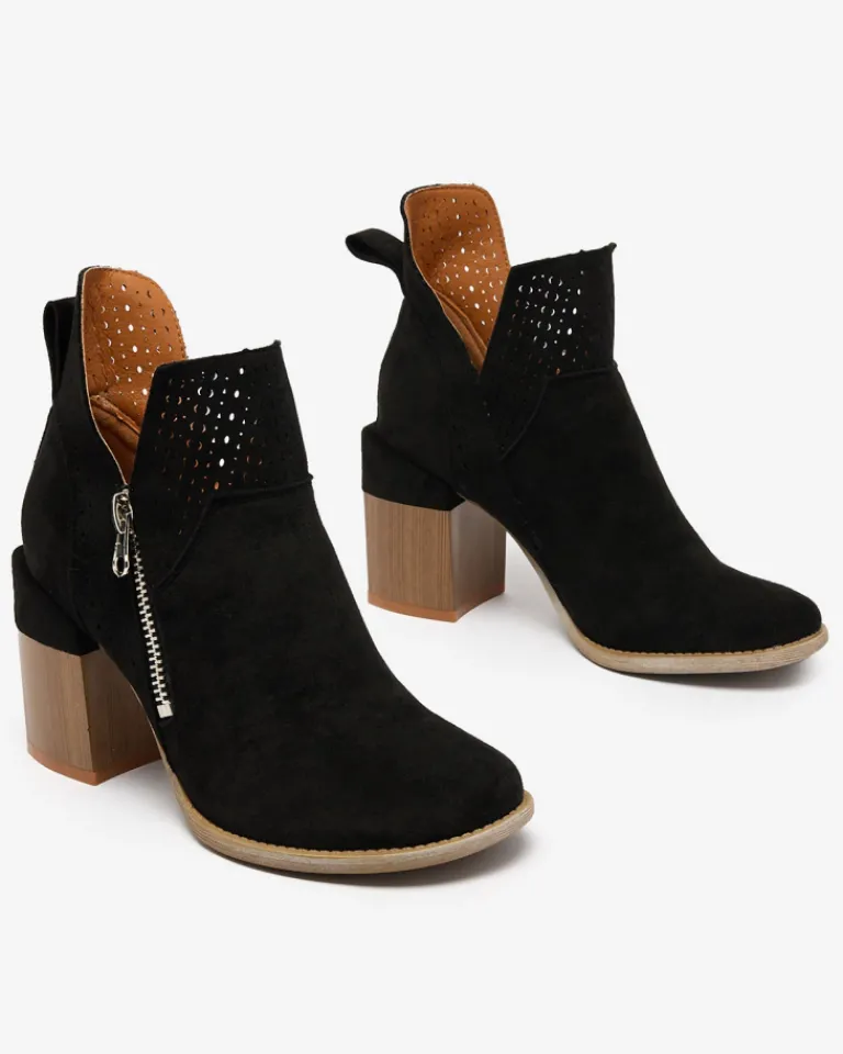 - Damskie botki na słupku z okrągłym noskiem. Cholewka wykonana z eko zamszu, w środku eko skórzana wkładka. Model z ażurowym wykończeniem, wycięciami przy kostce oraz zapinany na suwak po wewnętrznej stronie. Idealnie pasują do jesiennych stylizacji!