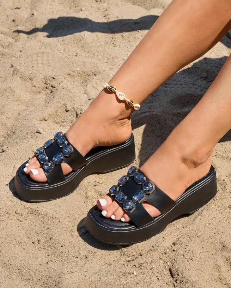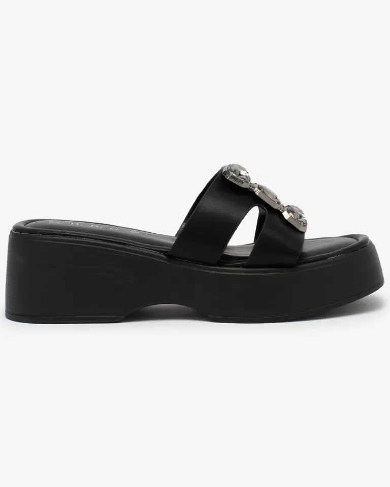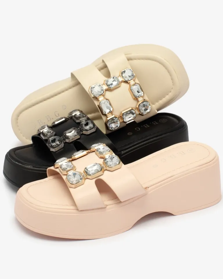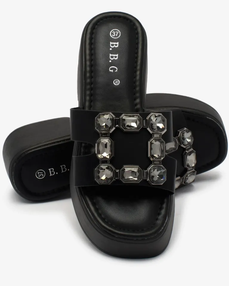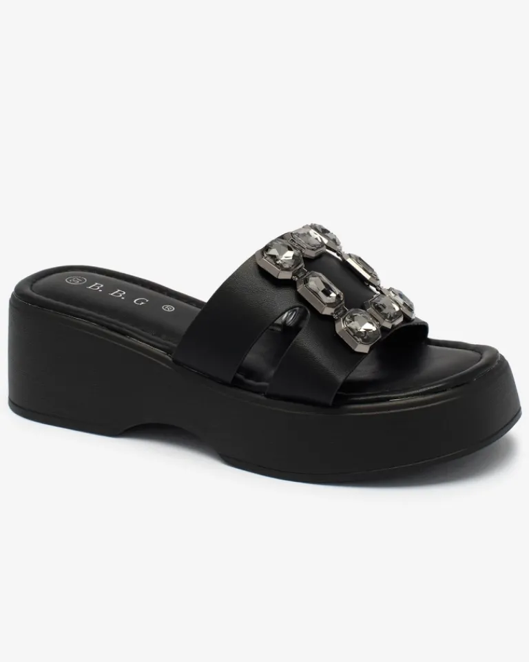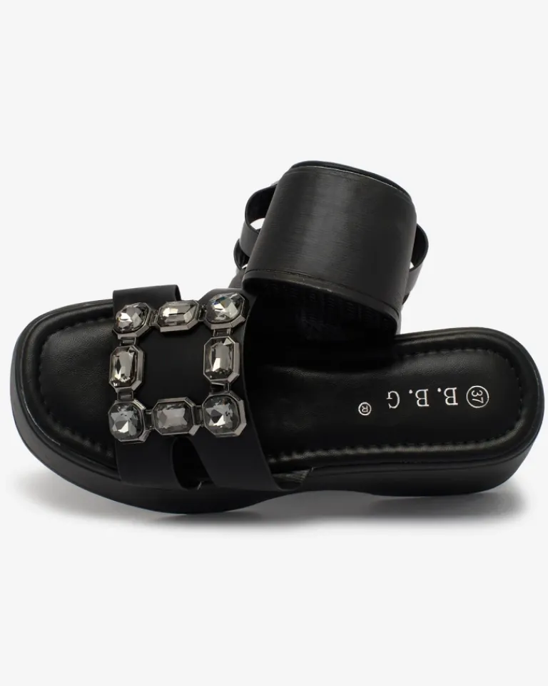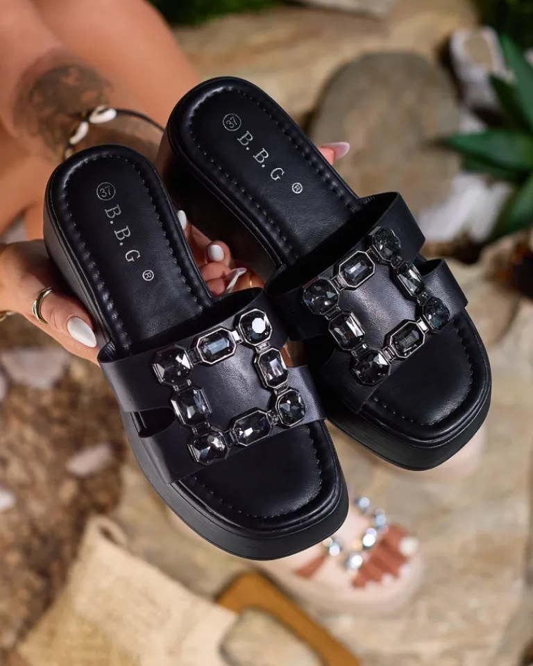 - Gustowne damskie klapki na masywnej podeszwie. Para w całości wykonana jest ze skóry ekologicznej I zdobiona dużymi kryształkami. Super dodatek do Twoich letnich casualowych outfitów!