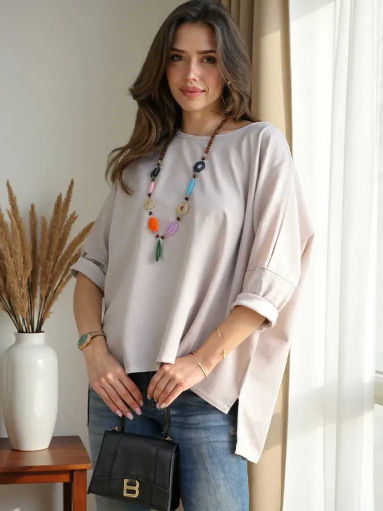 - Oryginalna damska bluzka z okrągłym dekoltem, wykonana z przyjemnej i miękkiej tkaniny. Produkt o luźnym kroju, posiada rękaw o długości 3/4. Dodatkowo naszyjnik w zestawie. Idealny wybór do tworzenia stylowych outfitów!
