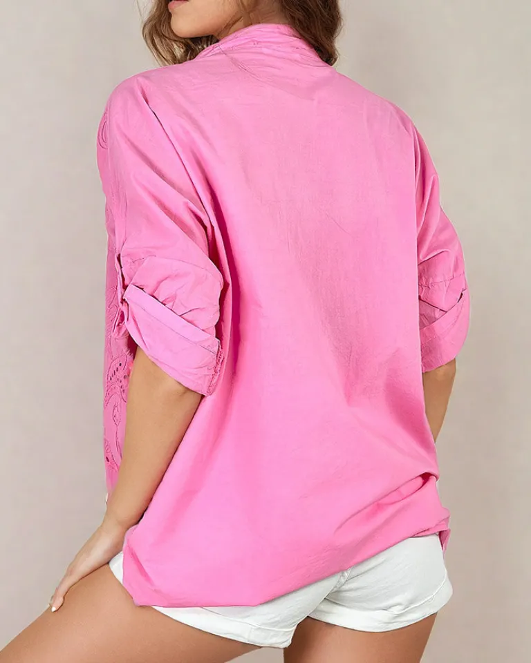- Klasyczna damska koszula oversize, wykonana z przyjemnej tkaniny. Posiada kołnierzyk, jest zapinana na guziki oraz ozdobny haft. Model posiada podwijane rękawki. Prosty krój zapewni dopasowanie do każdej sylwetki! UWAGA: Dokładność pomiaru (+/-) 1 cm.
