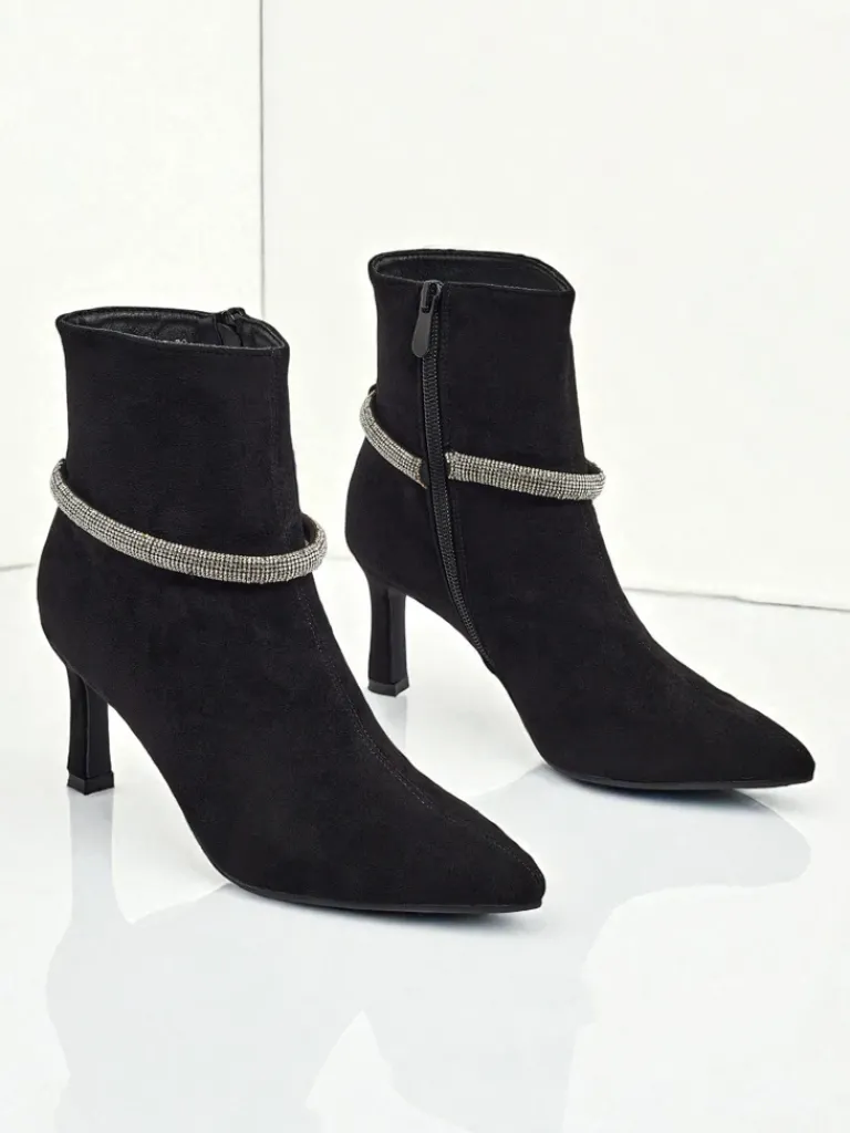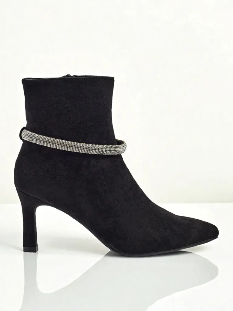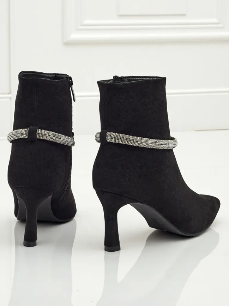 - Stylowe damskie eko-zamszowe botki – to idealne rozwiązanie na chłodniejsze dni. Model zapinany na suwak, posiada ocieplenie w formie futerka. Model na szpilce i ze spiczastym noskiem. Zdobiony paseczkiem z cyrkonii.