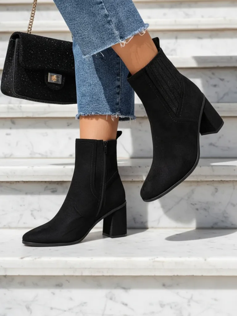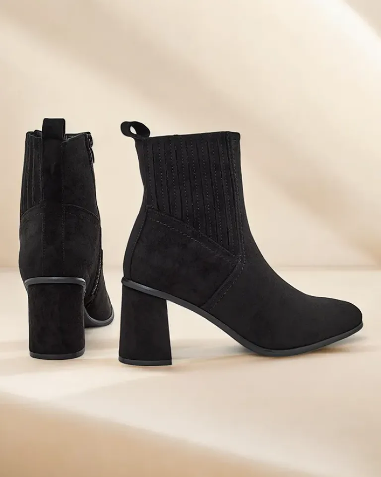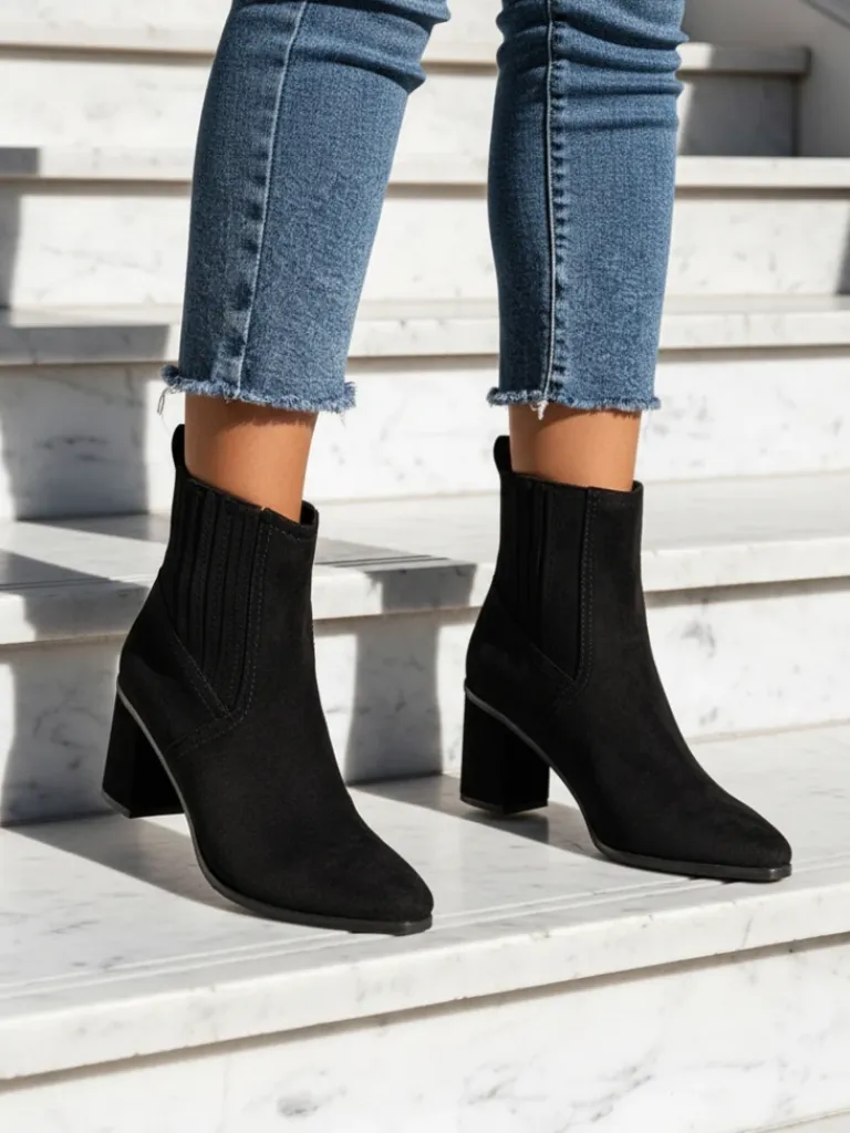 - Eleganckie botki na niewielkim słupku to idealne połączenie elegancji i wygody. Model wykonany z eko zamszowej skóry oraz posiada delikatne ocieplanie co daje stylowy wygląd na każdą okazję.