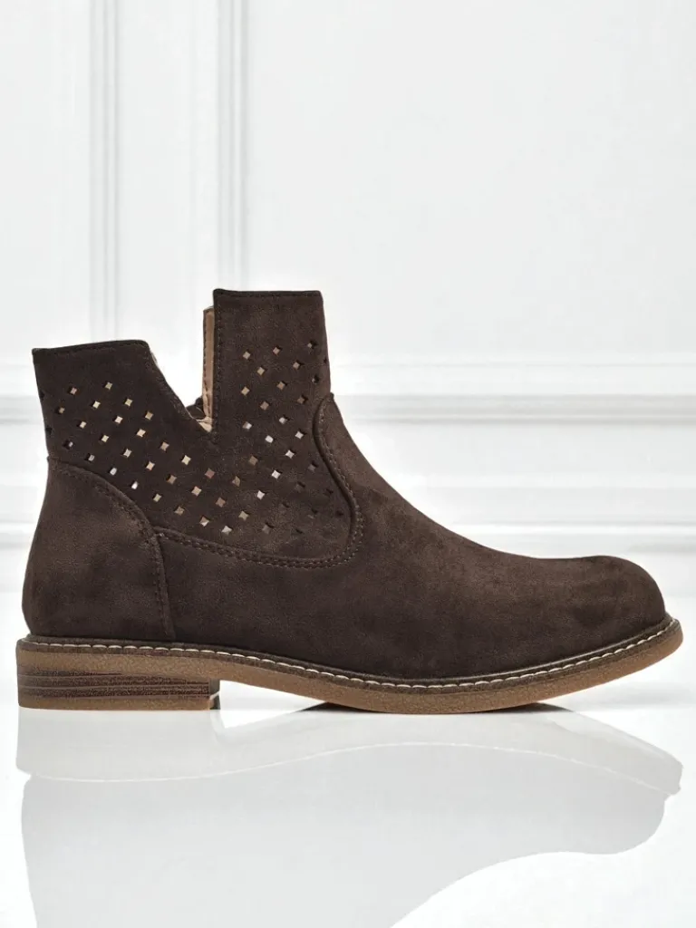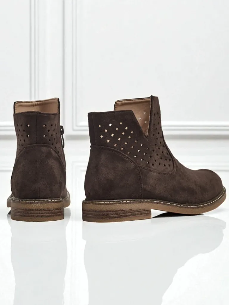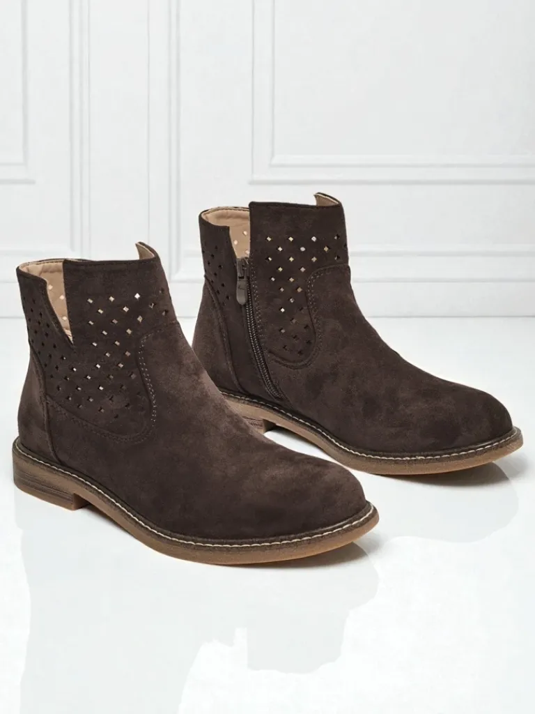 - Stylowe damskie eko zamszowe botki z wkładką ze skóry naturalnej to idealne rozwiązanie na chłodniejsze dni. Cholewka jest zapinana na suwak. Model na płaskim obcasie i z okrągłym noskiem. Super dodatek do Twoich casualowych outfitów!