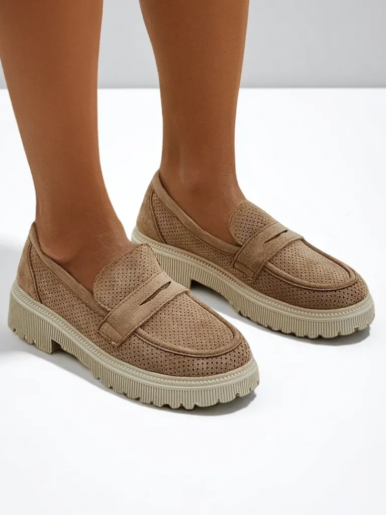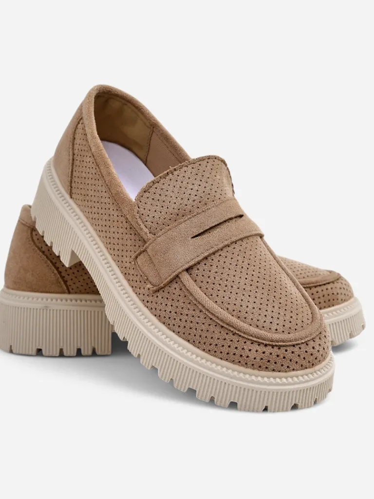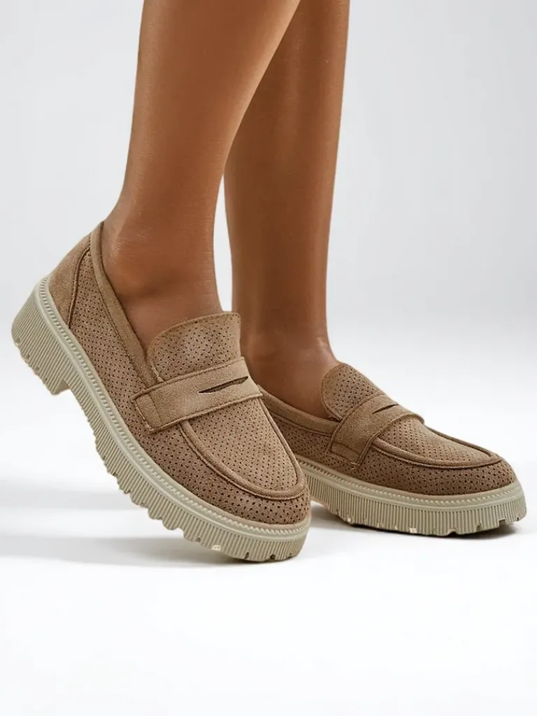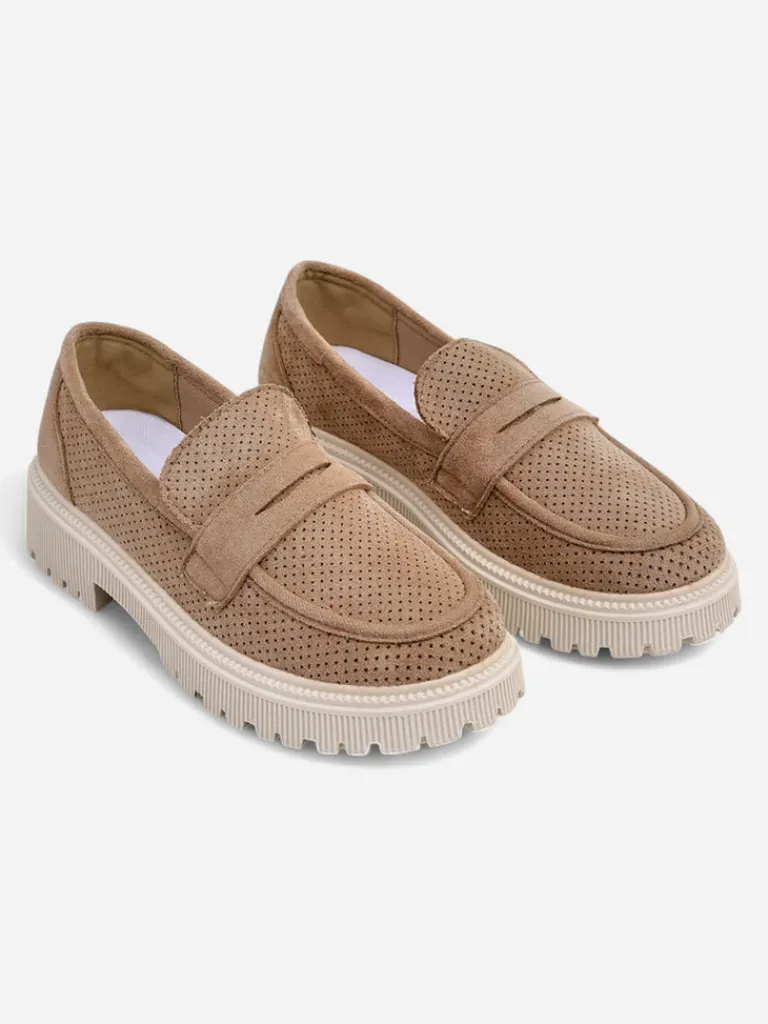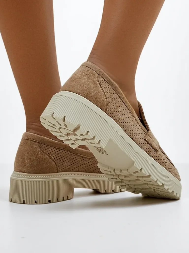 - Lekkie, damskie mokasyny na płaskiej podeszwie. Model w stylu casual i jest wykonany ze skóry ekologicznej zamszowej, wkładka to tkanina. Idealne do wiosennych outfitów!.