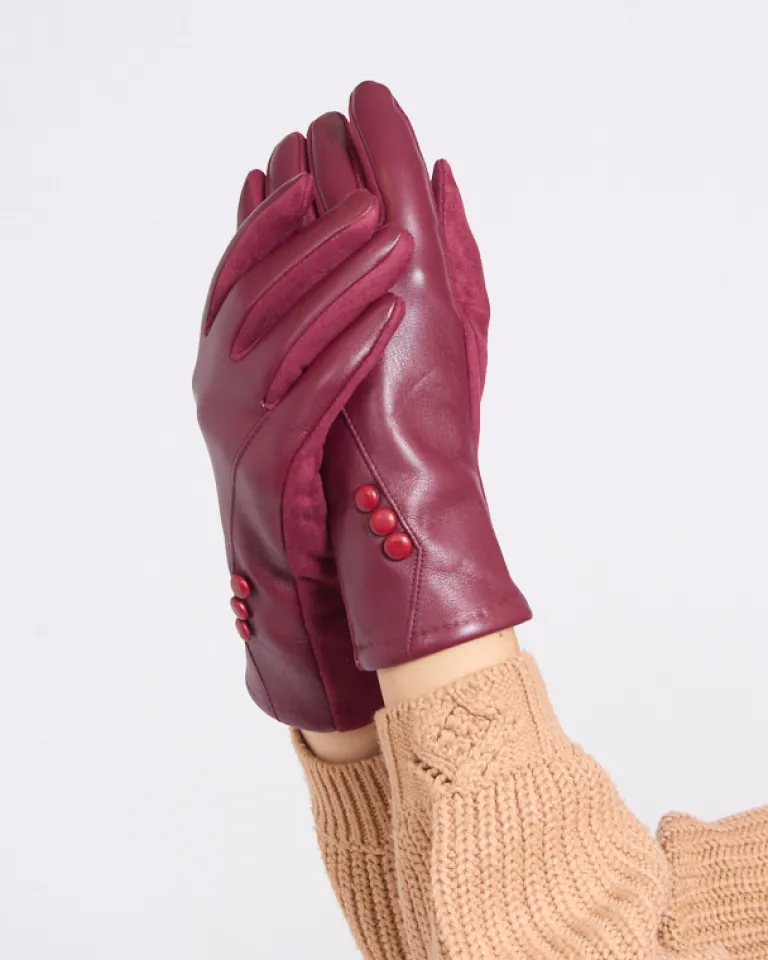 - Cieplutkie damskie rękawiczki z połączenia eko skóry i tkaniny. Wewnątrz cienka futrzana podszewka. Na palcu wskazującym satynowa naszywka umożliwiająca obsługę dotykowych ekranów.