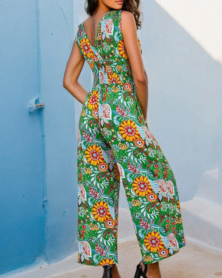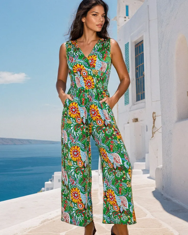 - Modny kombinezon damski na ramiączkach z długimi, prostymi i szerokimi nogawkami. Dekolt w literkę V oraz gumą w talii. Model posiada ozdobny print. Idealny do letnich stylizacji!