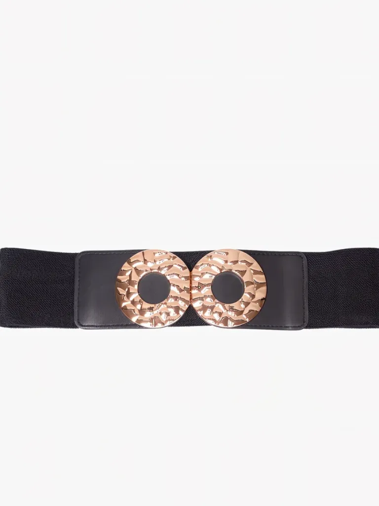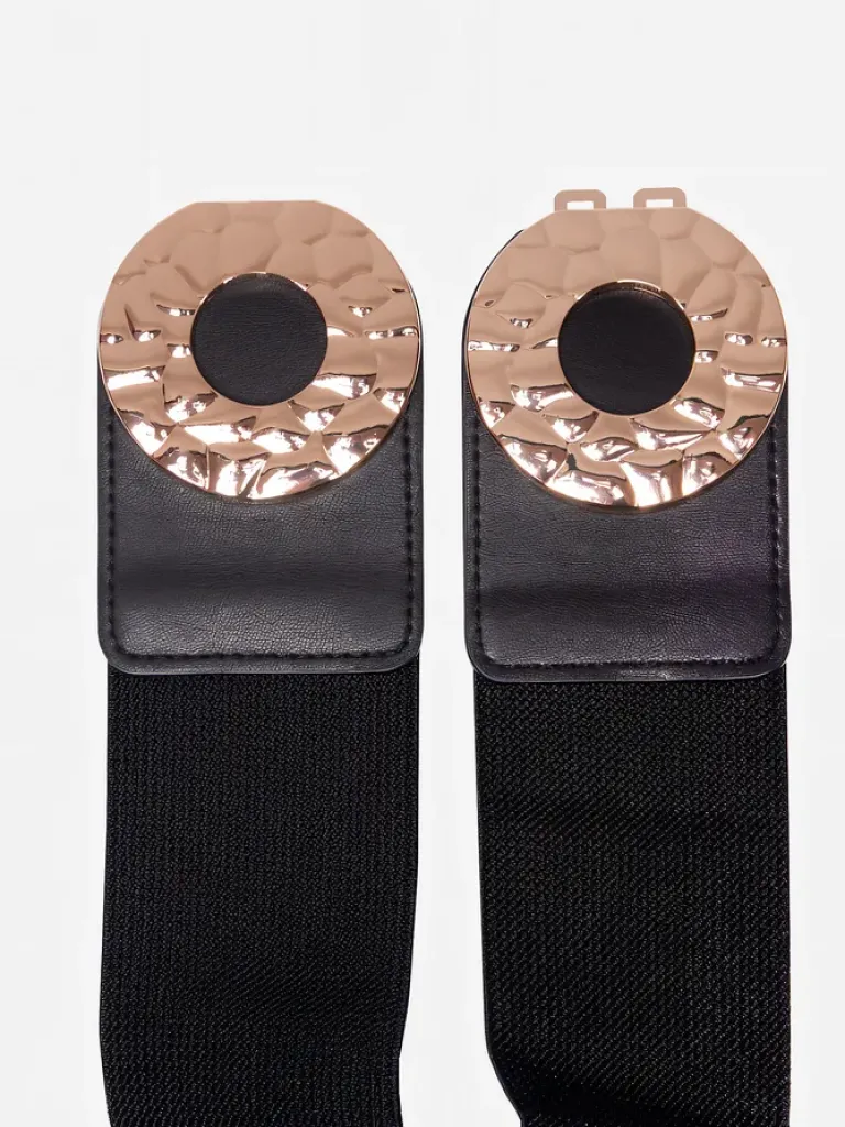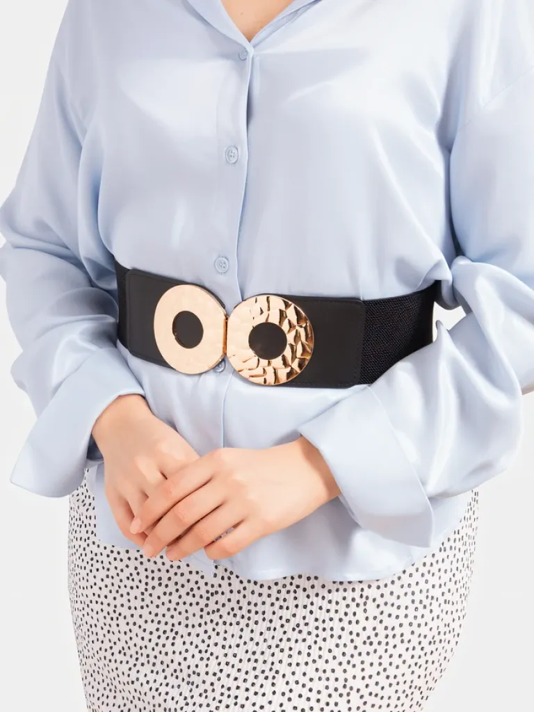 - Świetny pasek damski z dużą złotą klamrą, wykonany z połączenia skóry ekologicznej oraz gumy. Ten efektowny model idealnie pasuje do sukienek i spodni.