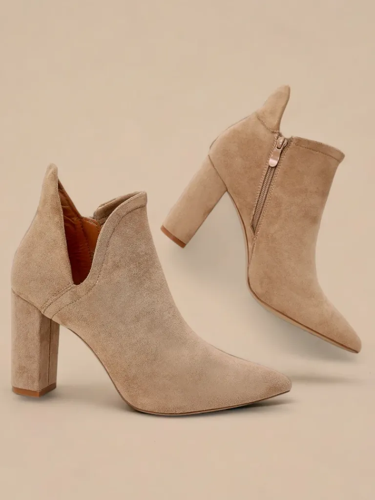 - Rewelacyjne botki na wysokim obcasie w kolorze jasnobrązowym. Cholewka wykonana z miękkiego eko-zamszu, zaś wkładka pokryta tkaniną. Nosek zakończony w szpic, który optycznie wyszczupla nogi. Model zapinany na suwak po wewnętrznej stronie.