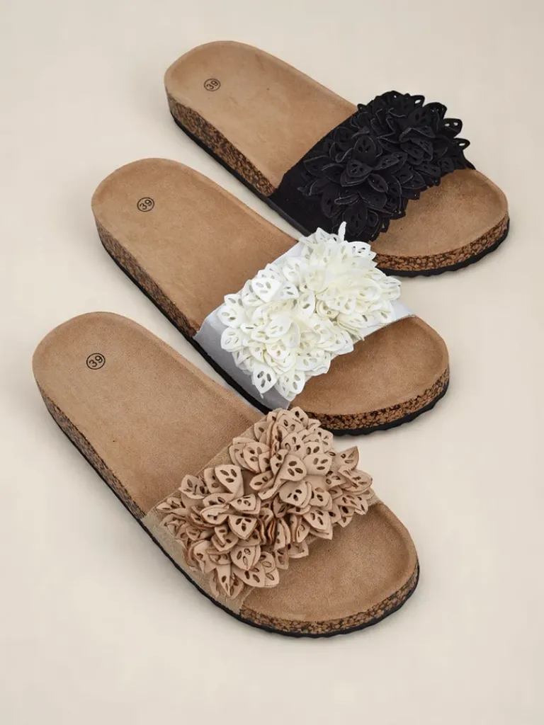- Przepiękne klapki damskie wykonane ze skóry ekologicznej zamszowej, zdobione kwiatuszkami. Gumowa podeszwa zdobiona materiałem a’la korek. Model w ciekawej kolorystyce. Idealnie uzupełnią letnie stylizacje!