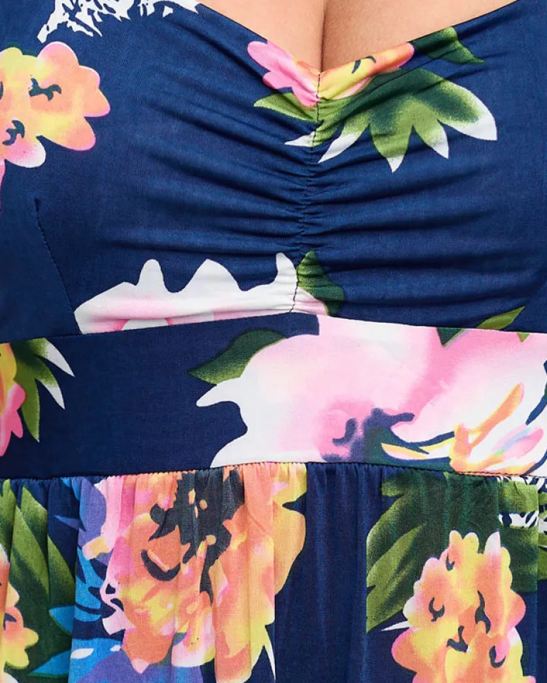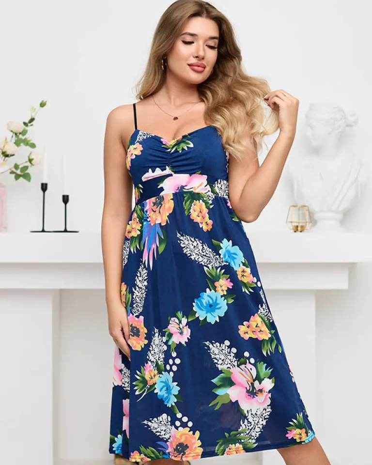- Sukienka do kolan z kwiatowym motywem. Model o luźnym kroju, posiada odcięcie w pasie z gumką oraz regulowane ramiączka. Doskonała sukienka na lato! UWAGA: Dokładność pomiaru (+/-) 1 cm.