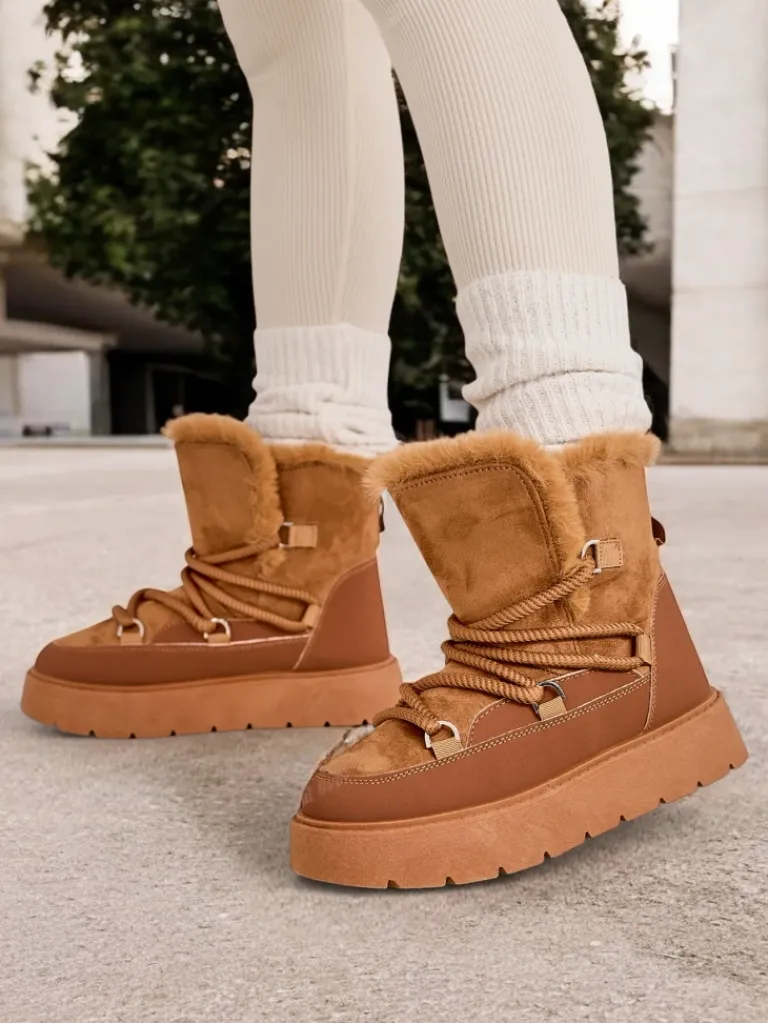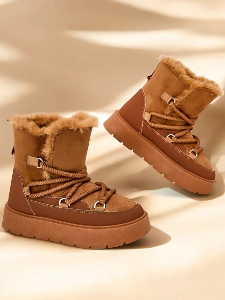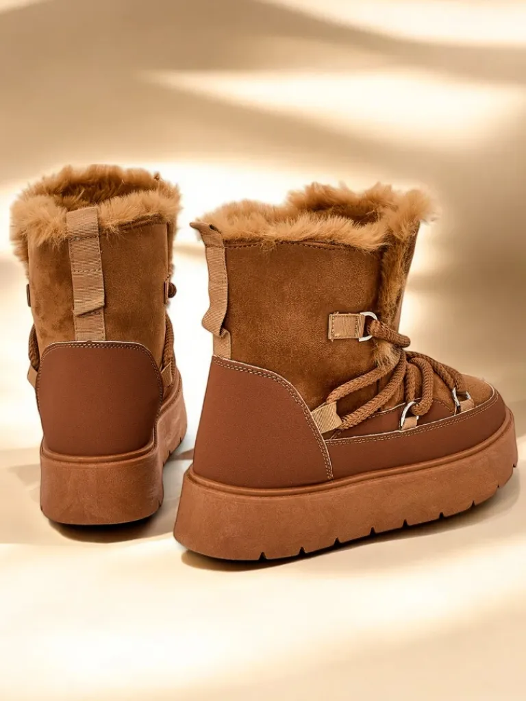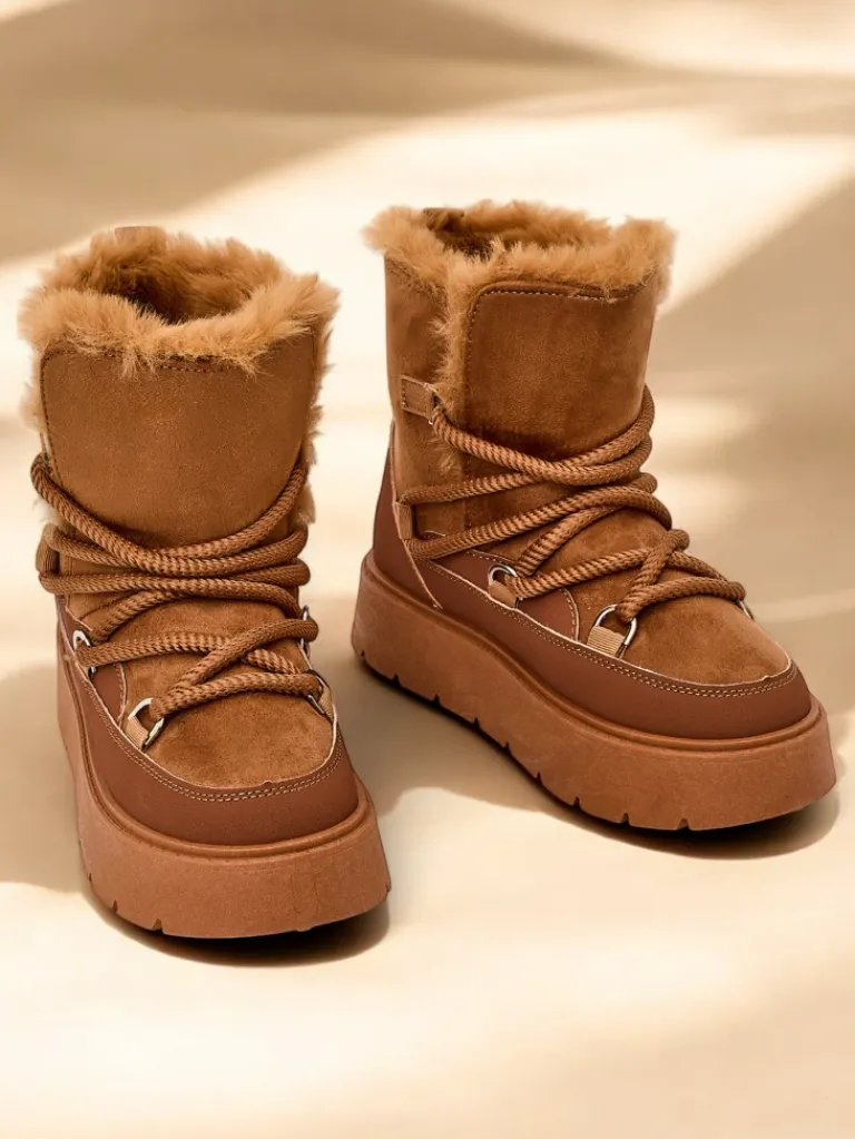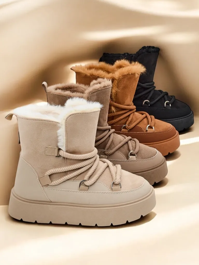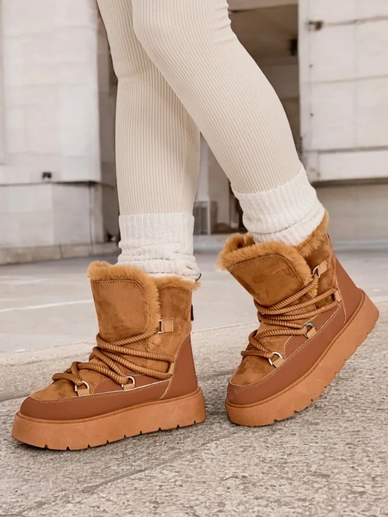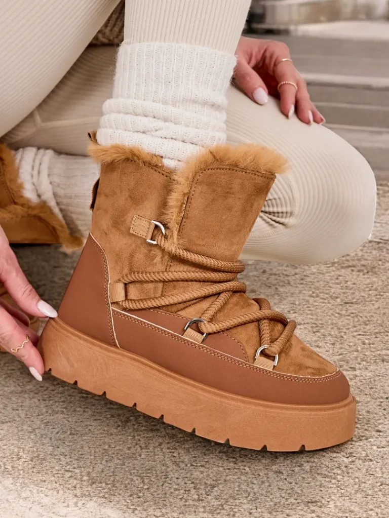 - Damskie obuwie typu śniegowce z cholewką wykonaną z zamszowej eko skóry. W środku ocieplane przyjemnym futerkiem, obuwie sznurowane. Idealne na zimę!