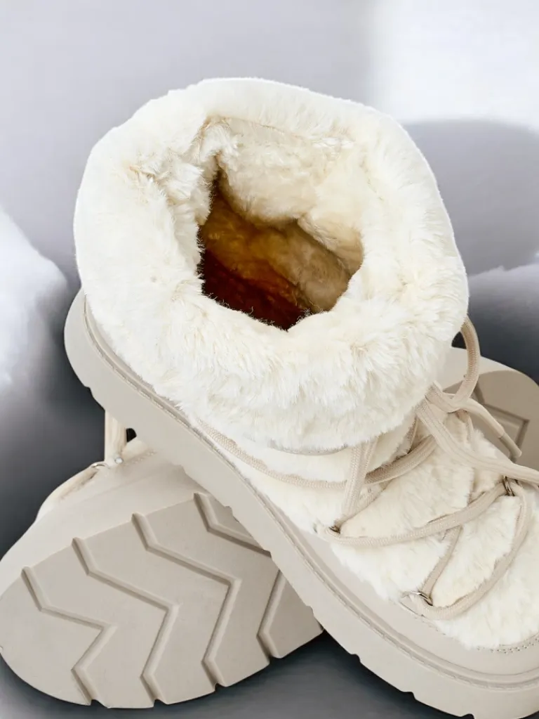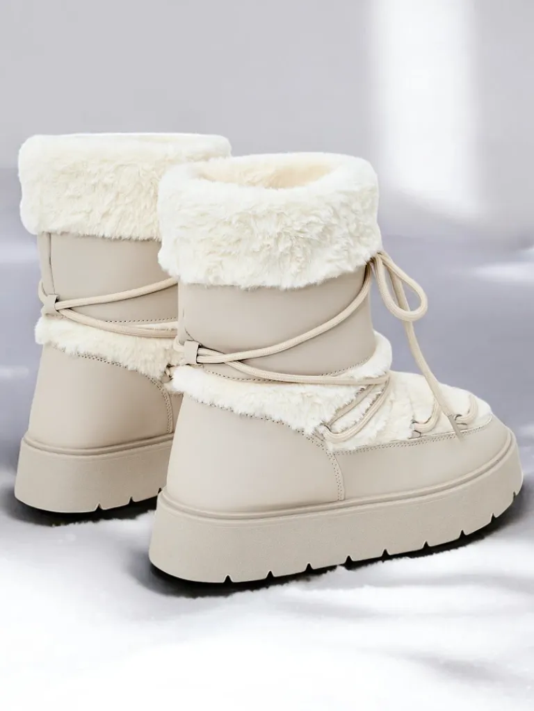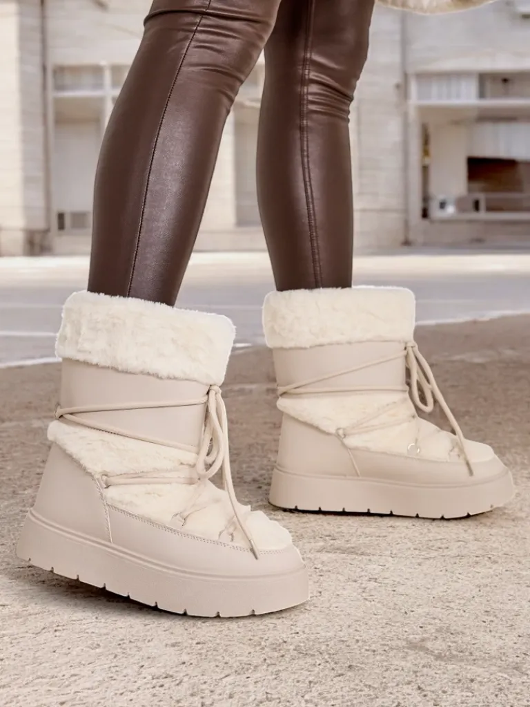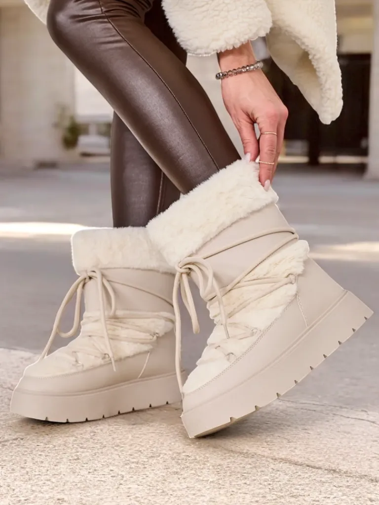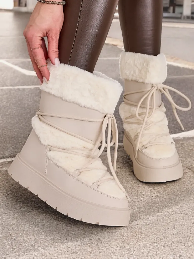 - Damskie obuwie typu śniegowce z cholewką wykonaną z połączenia eko skóry oraz przyjemnej tkaniny. W środku przyjemne futerko, obuwie posiadają sznurowaną cholewkę. Idealne na zimę!