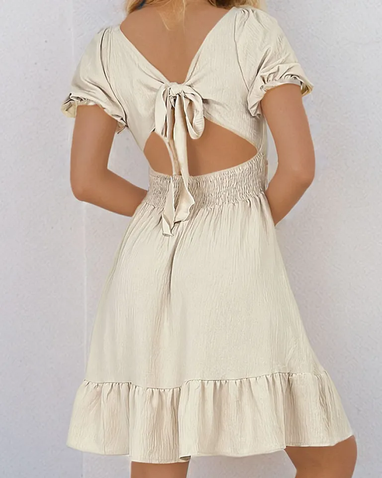 - Lekka damska sukienka z ozdobnymi falbankami oraz ozdobnym wiązaniem z tyłu, długości do kolana, wykonana z przyjemnej tkaniny. Model z prostym dekoltem a’la hiszpanka oraz gumą na szerokość talii. Załóż ją do sandałków! UWAGA: Dokładność pomiaru (+/-) 1