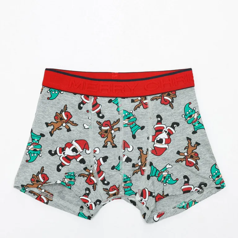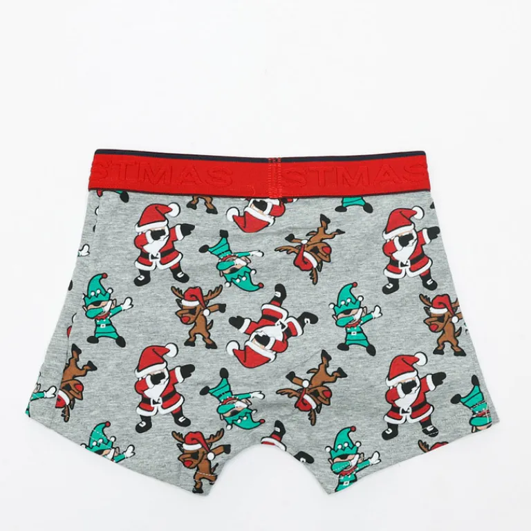 - Wyjątkowe chłopięce bokserki wykonane z materiału bawełnianego, wykończone ozdobnym printem świątecznym. W pasie elastyczna guma z napisem . UWAGA: Dokładność pomiaru (+/-) 1 cm.
