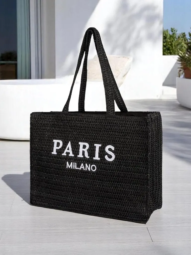 - Duża, pleciona torebka słomiana z napisem Paris Milano. 1 komora, kieszonka, zapięcie na zamek. Stylowa, pojemna i lekka – must have na lato i codzienne wyjścia!