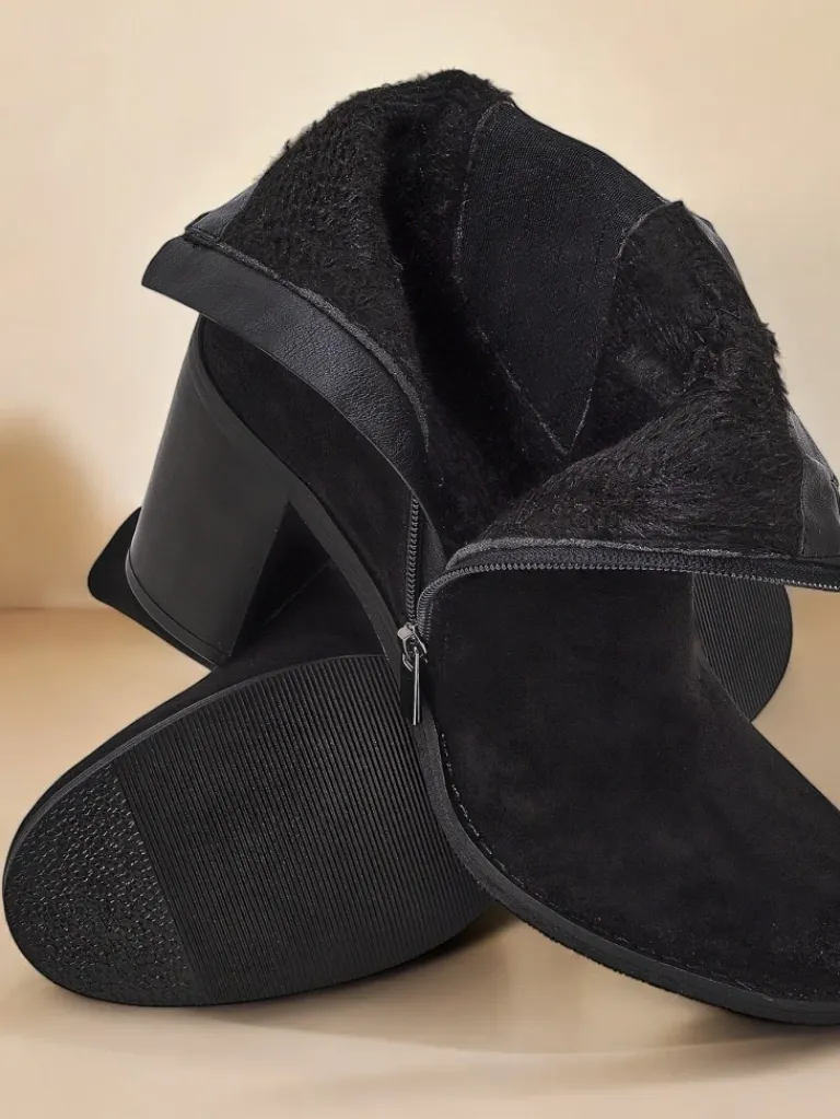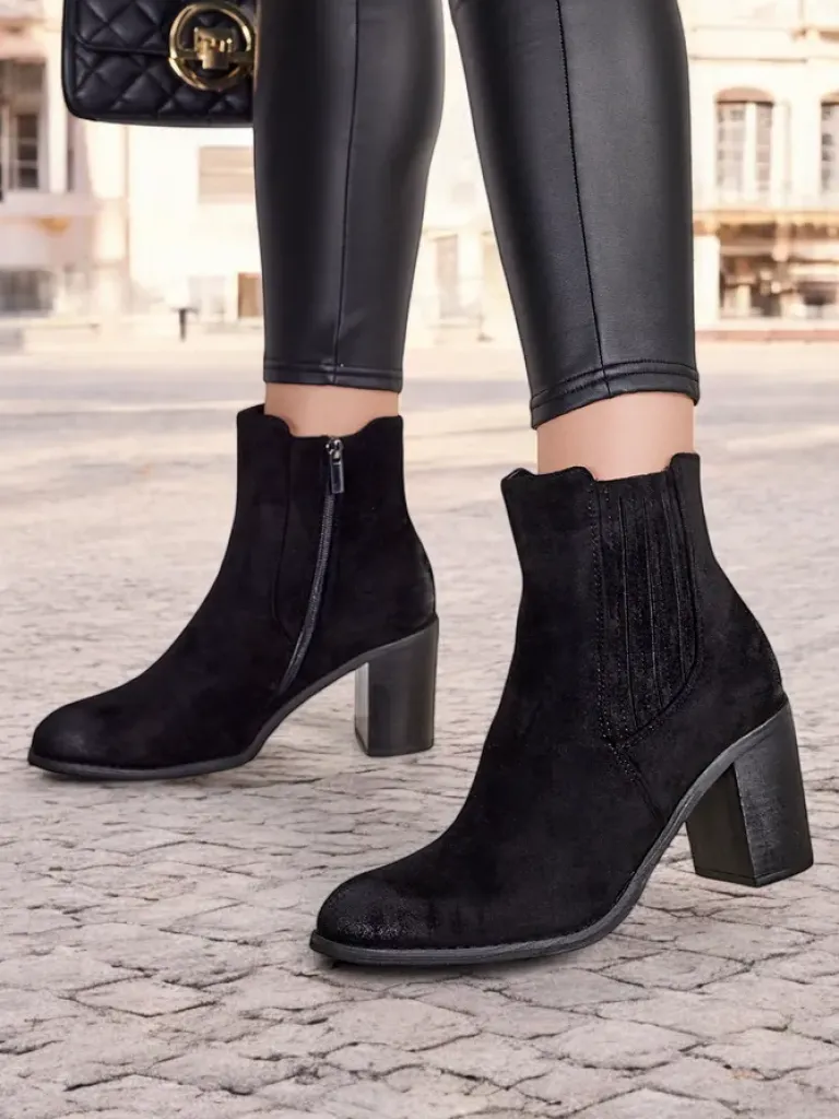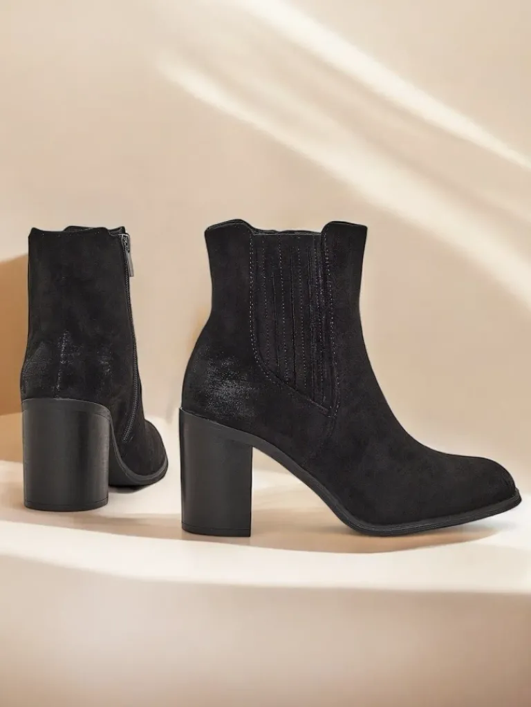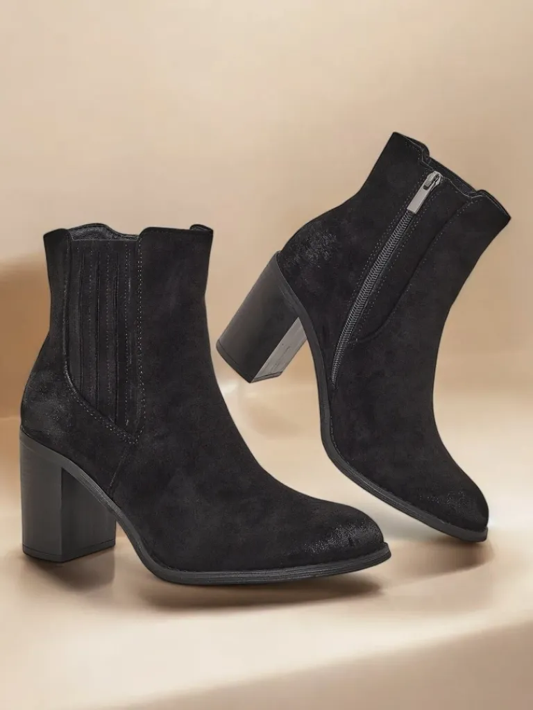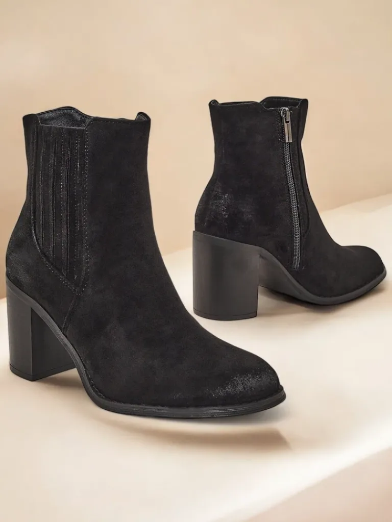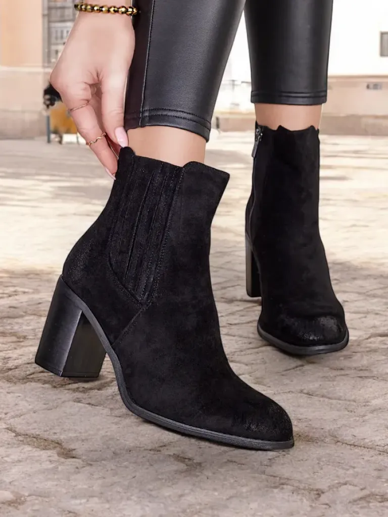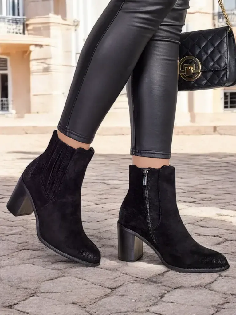 - Stylowe damskie botki to idealne rozwiązanie na chłodniejsze dni. Eko zamszowa cholewka jest zapinana na suwak, a w środku delikatne ocieplenie. Model na słupku, z okrągłym noskiem. Obuwie posiada ozdobne przetarcia na cholewce.