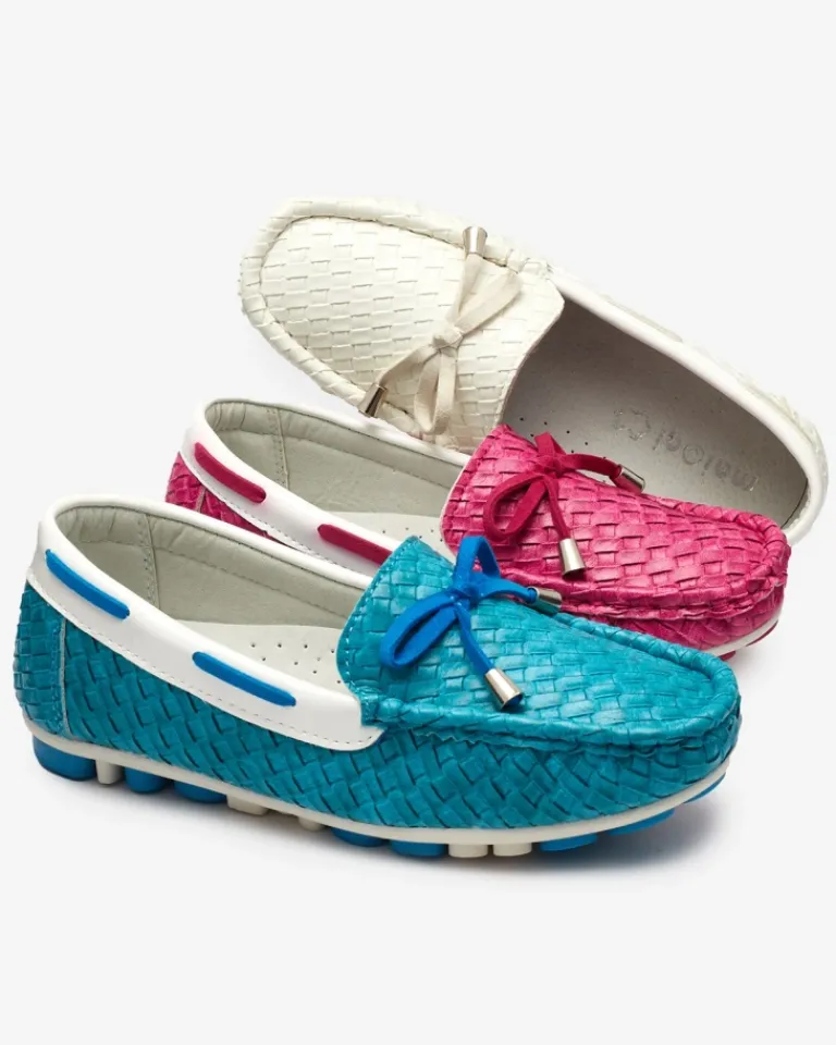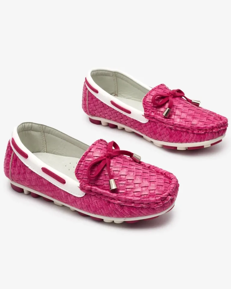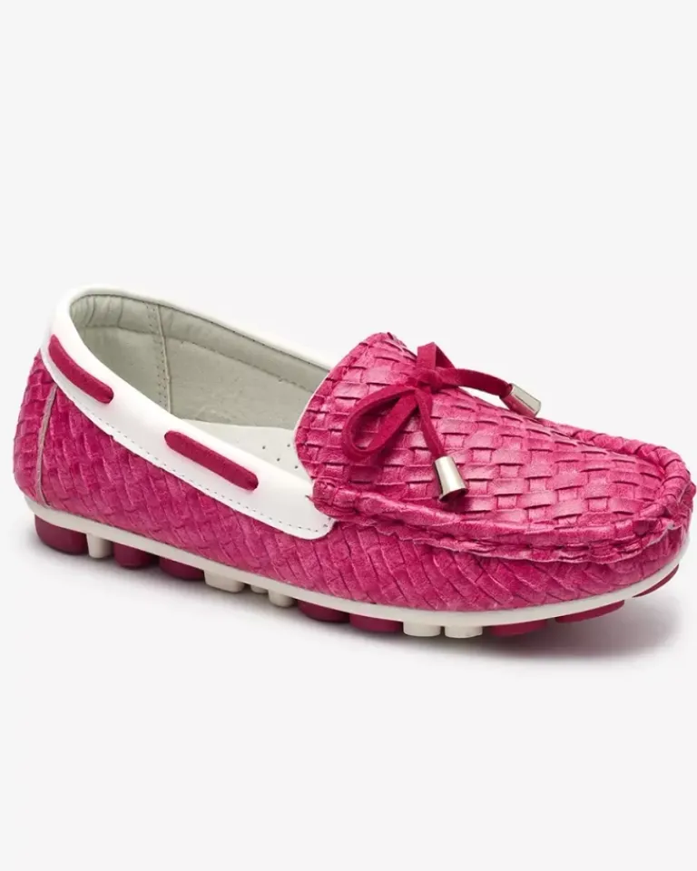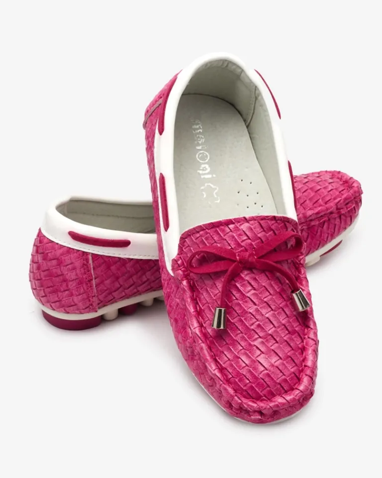- Wyjątkowe dziecięce mokasyny wykonane ze skóry ekologicznej. Cholewka posiada wykończenie we wzór a’la plecionka. Wkładka wyłożona skórą naturalną. Idealnie obuwie na wiosnę! Uwaga: produkt posiada przebarwienia na materiale.