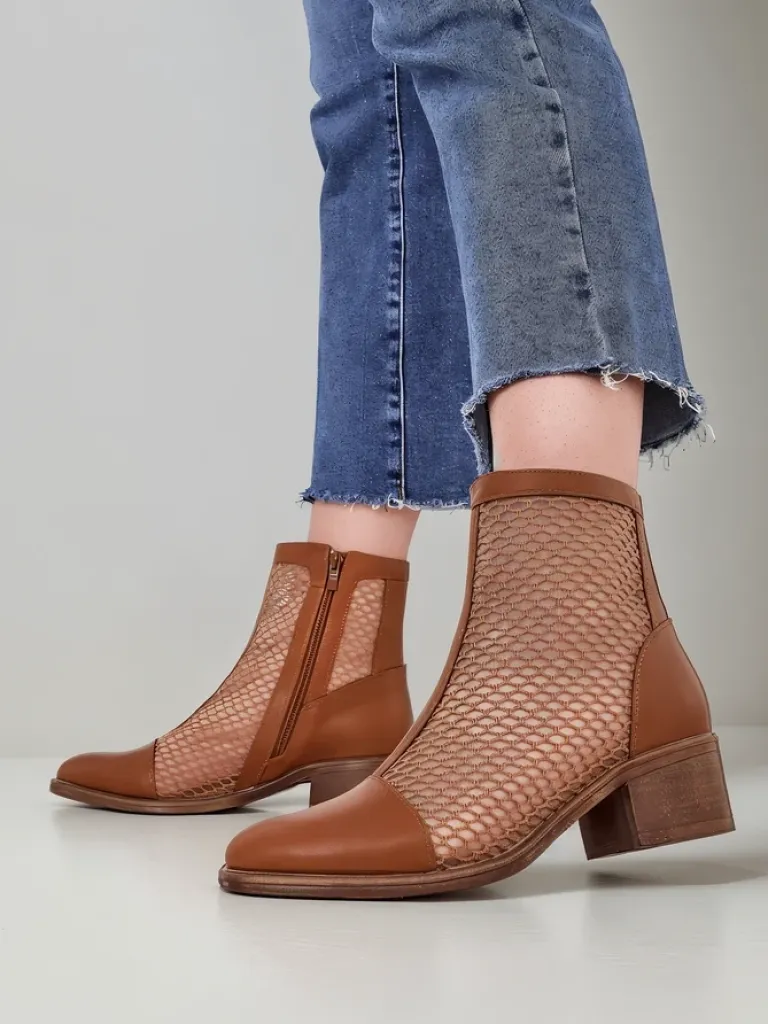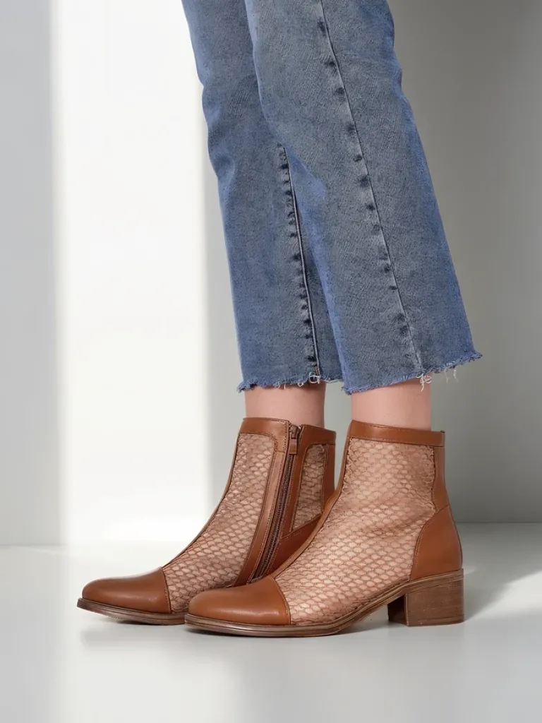 - Wyjątkowe botki damskie wykonane z tkaniny a’la siateczka i skóry ekologicznej z wykończeniem ażurowym oraz eko skórzanej wkładki. Model zapinany na zamek. Idealne do jesiennych stylizacji!.