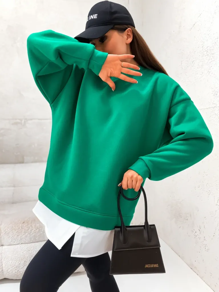 - Dodaj uroku swoim stylizacjom z Naszą oversize bluzą damską. Wkładana przez głowę, z okrągłym dekoltem i długimi rękawami. Model z możliwością dopięcia na zamek dolnej części a’la koszula. Idealna na co dzień, gdy chcesz poczuć się swobodnie!