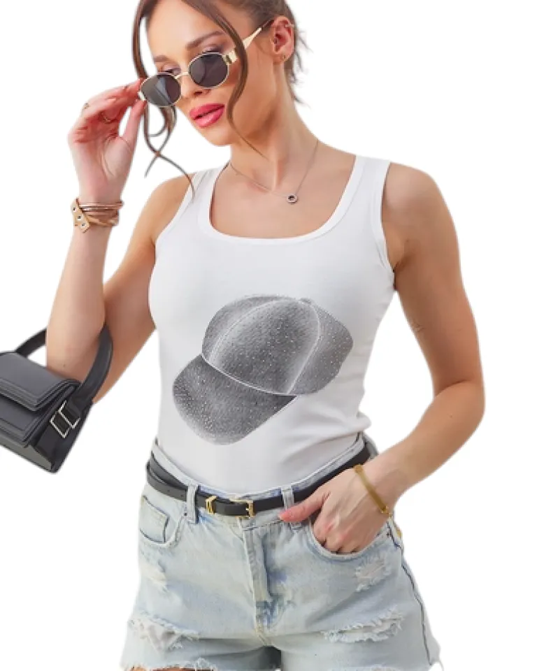 - Bawełniana damska bluzka na ramiączkach z nadrukiem czapeczki, łącząca wygodę z modnym akcentem. Idealna na letnie dni, dodaje luzu i stylu każdej casualowej stylizacji.