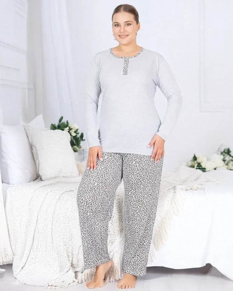 - Damska 2-częściowa piżama wykonana z tkaniny bawełnianej wykończonej ozdobnym printem. Komplet posiada bluzkę z długimi rękawami i guzikami oraz spodnie z gumą w pasie i prostymi nogawkami.